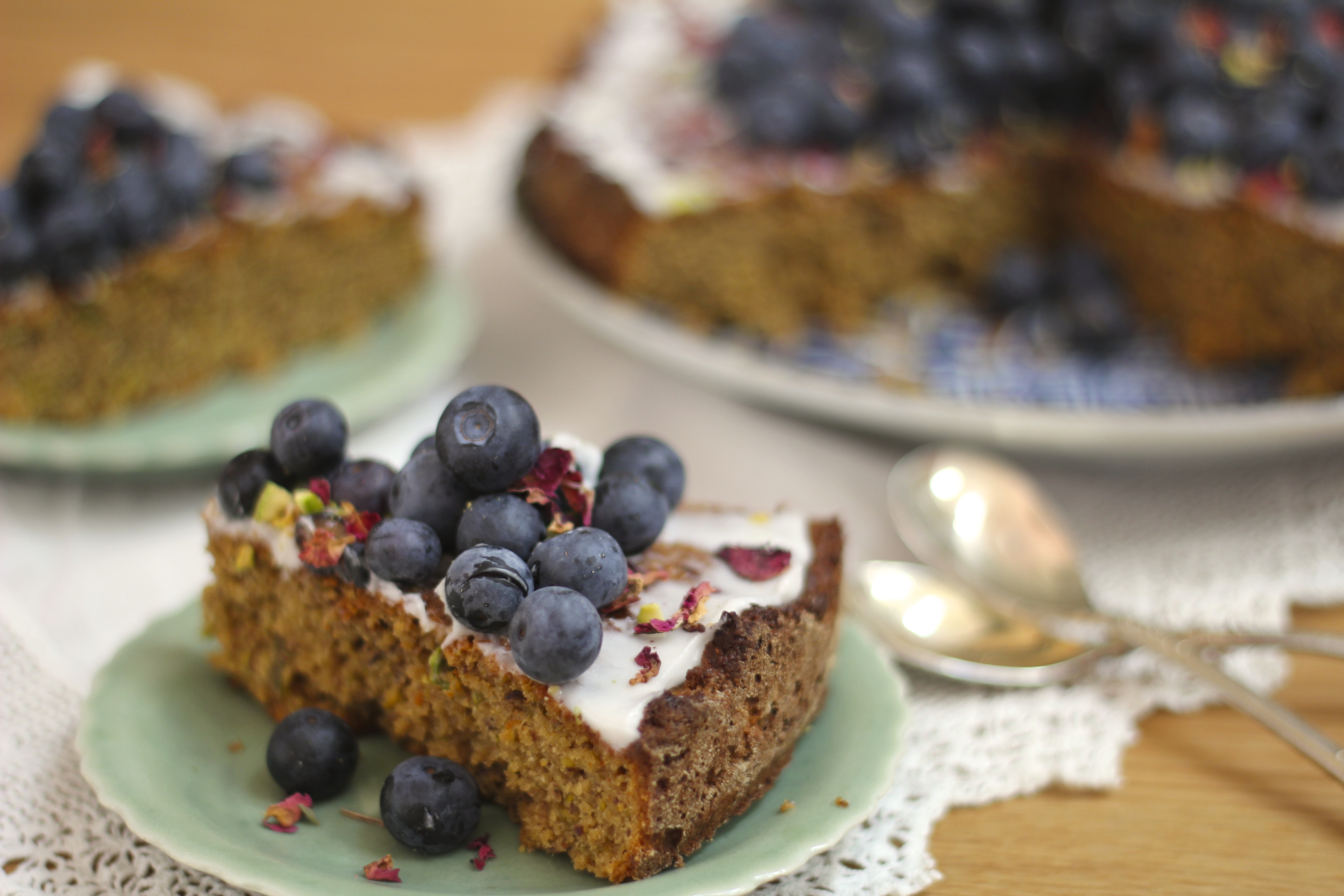 Spread the coconut icing over the cake, pile the blueberries in the middle, and sprinkle the crushed pistachios and rose petals over the top. Enjoy fresh, or keep in an air-tight container in the fridge for up 3 – 4 days.