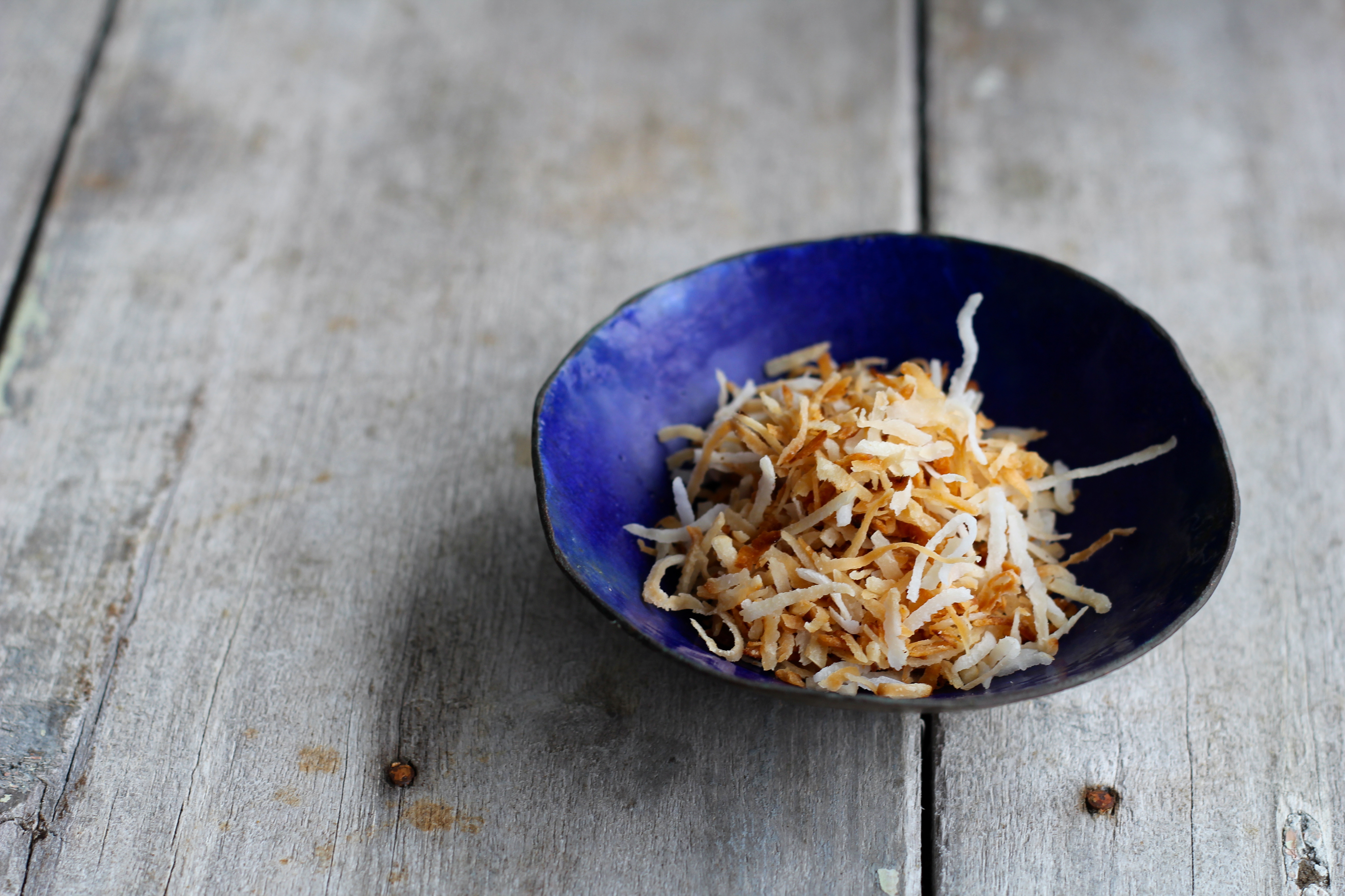 Toast the shredded coconut in a pan over a high heat, tossing continually until it starts to brown and smell deliciously toasty, about 2 minutes. As soon as the coconut browns, remove from pan and leave to cool.