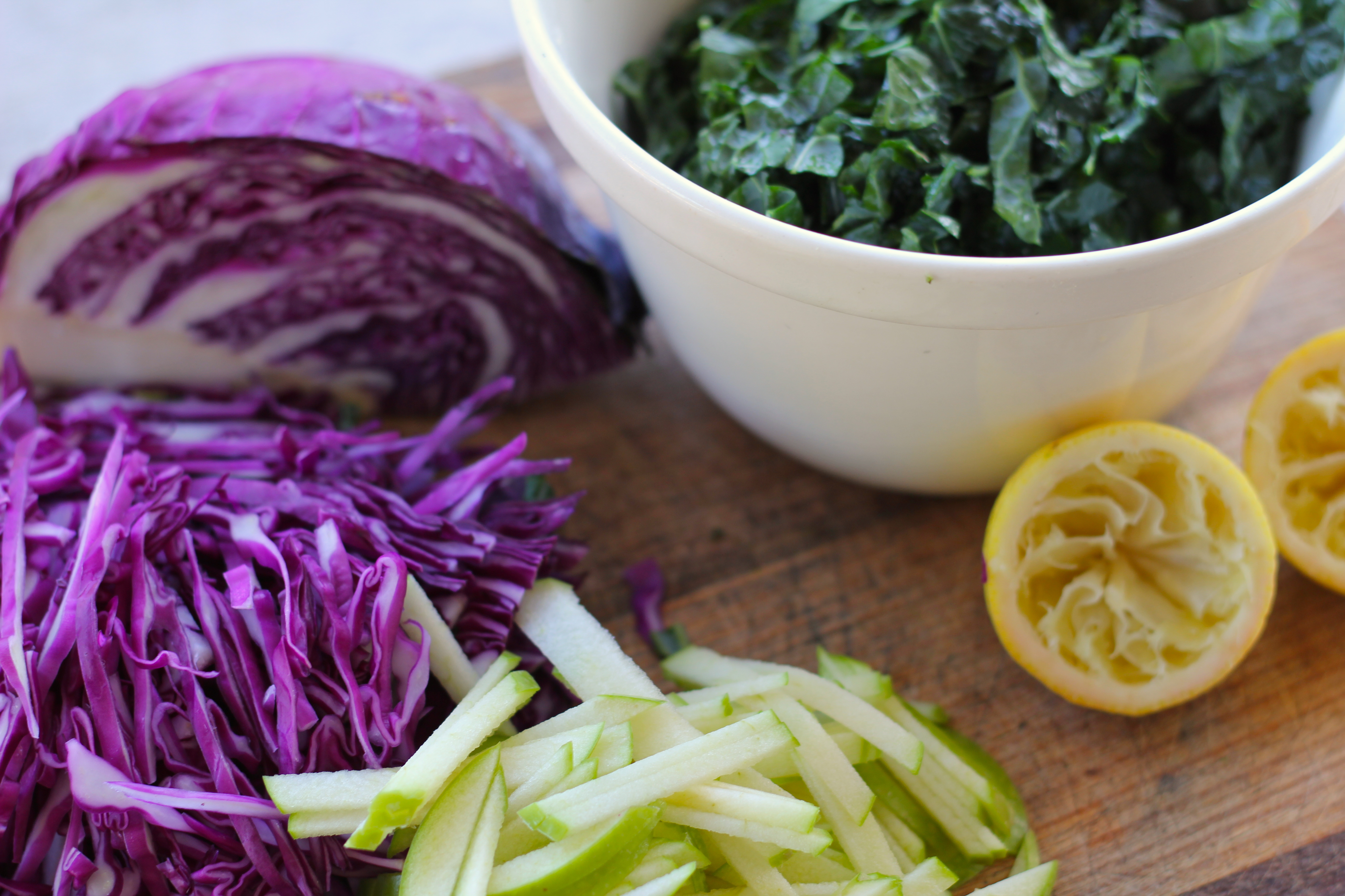 In the meantime, finely slice the purple cabbage and the apple (I use a mandoline for the apple). Once the kale has finished marinating, throw the cabbage and the apple in, and mix to combine.