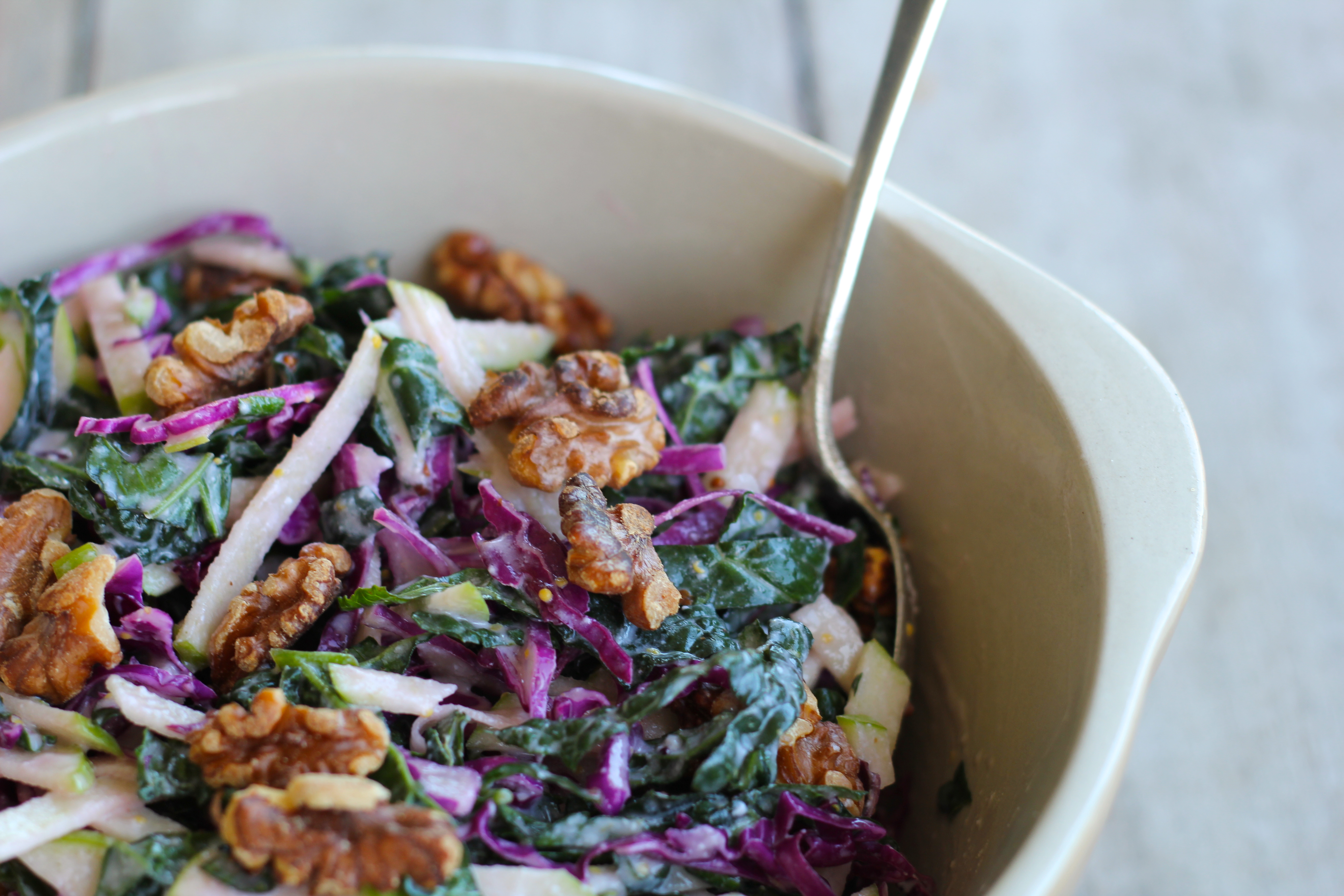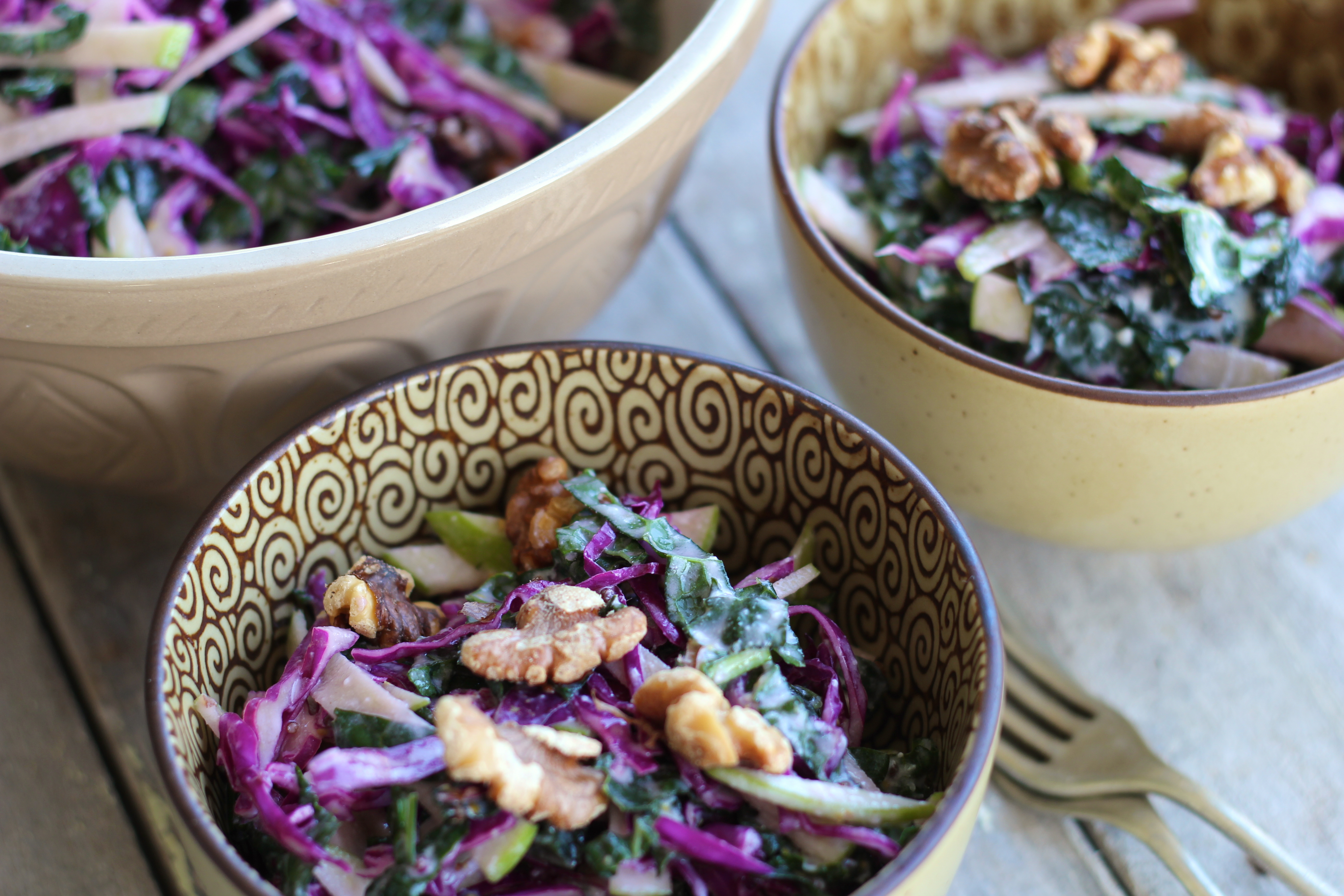 Pour the dressing over the salad and mix to thoroughly combine. Leave for an hour before eating to let the kale and cabbage soften. Before serving, top with the toasted walnuts.