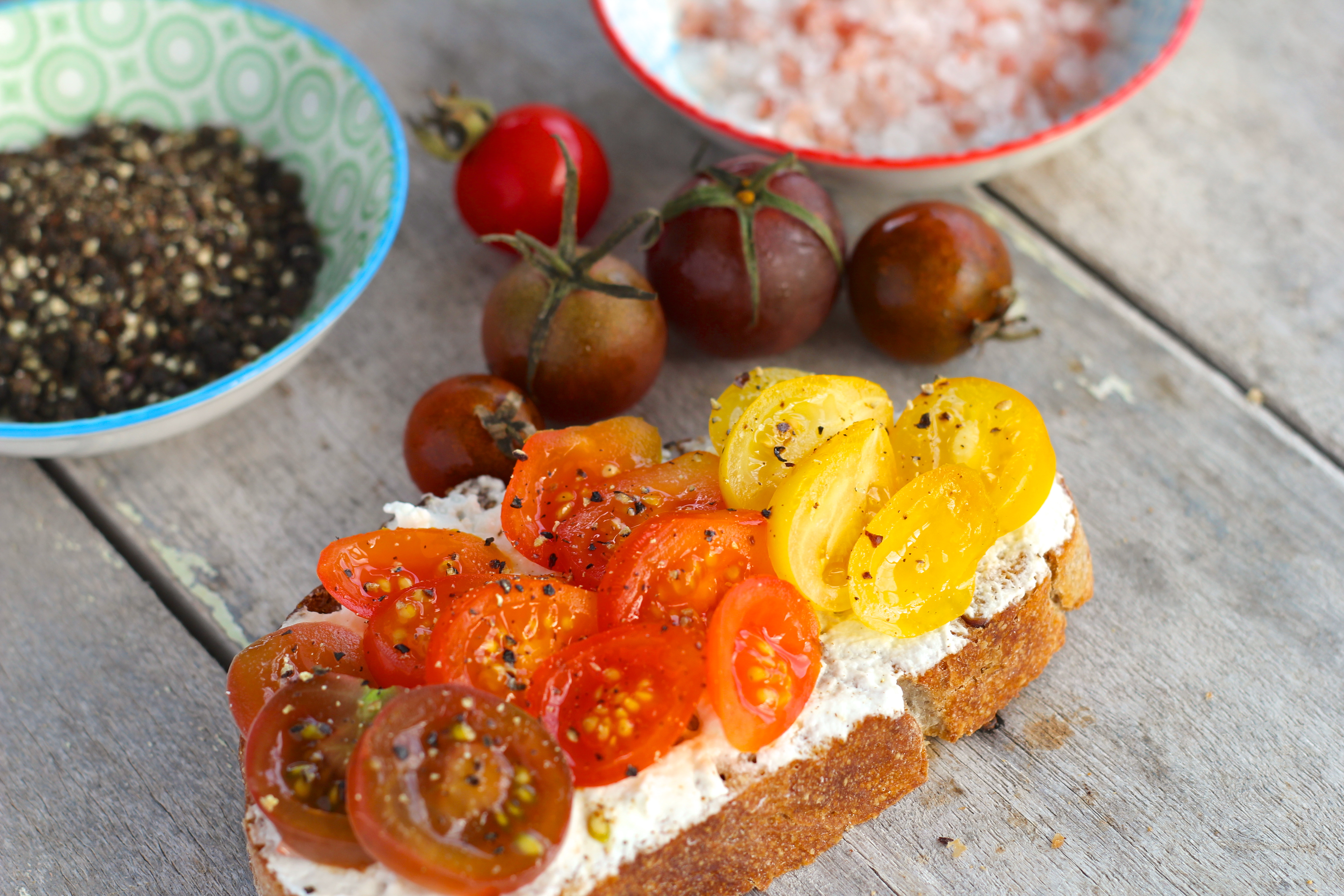 - Sliced baby tomatoes, cracked pepper, and sea salt