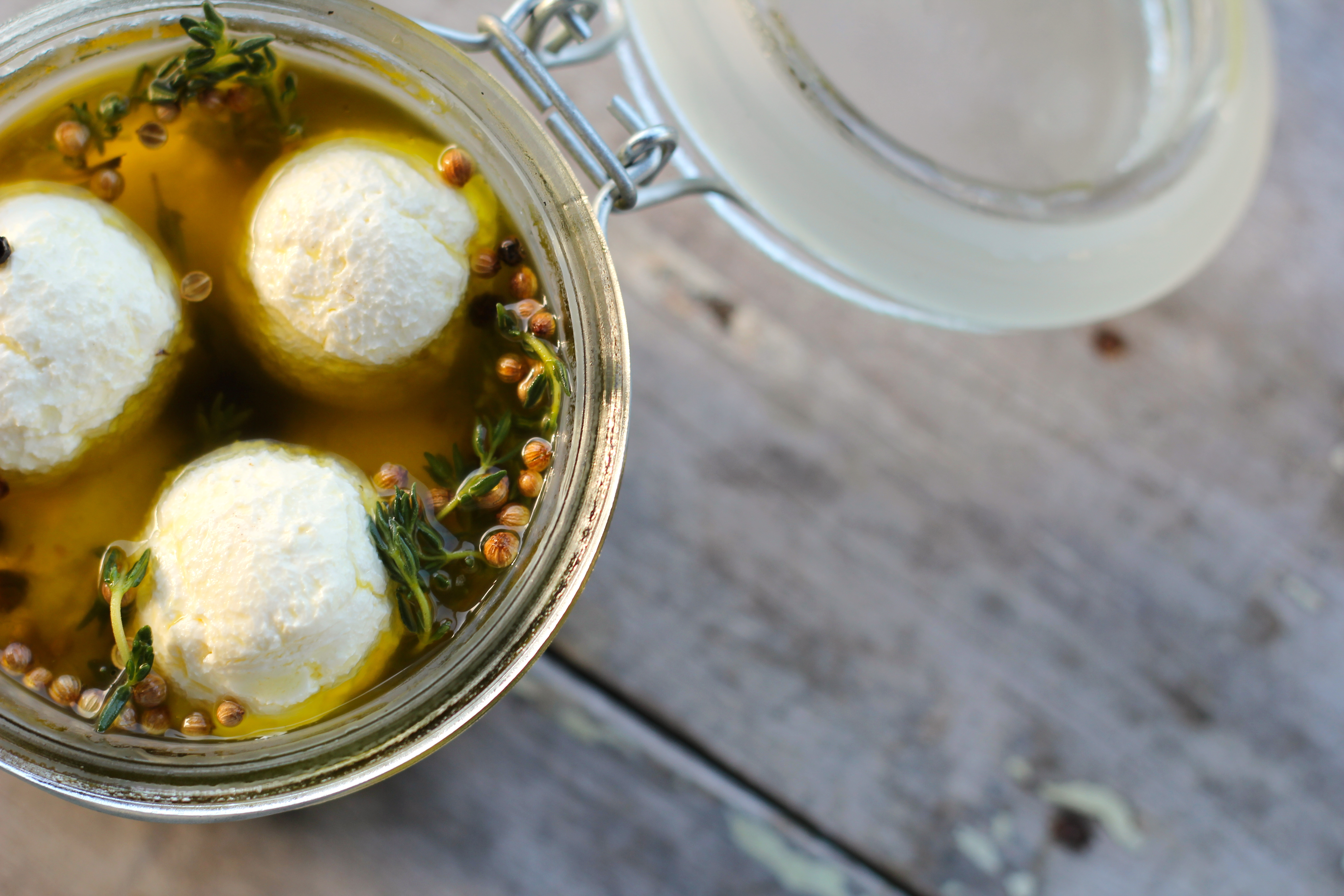 To store in oil, use your hands to form small balls of labneh and gently place them into a clean jar. Add whatever spices and herbs you like to the jar (for this batch I used 1 tsp coriander seeds, 1 tsp black peppercorns, and a few springs of fresh thyme). Pour extra-virgin olive oil over the whole lot and leave to marinate for at least 12 hours before eating. Stored like this, your labneh should last about 4 – 6 weeks in the fridge – although ours always gets eaten well before that!