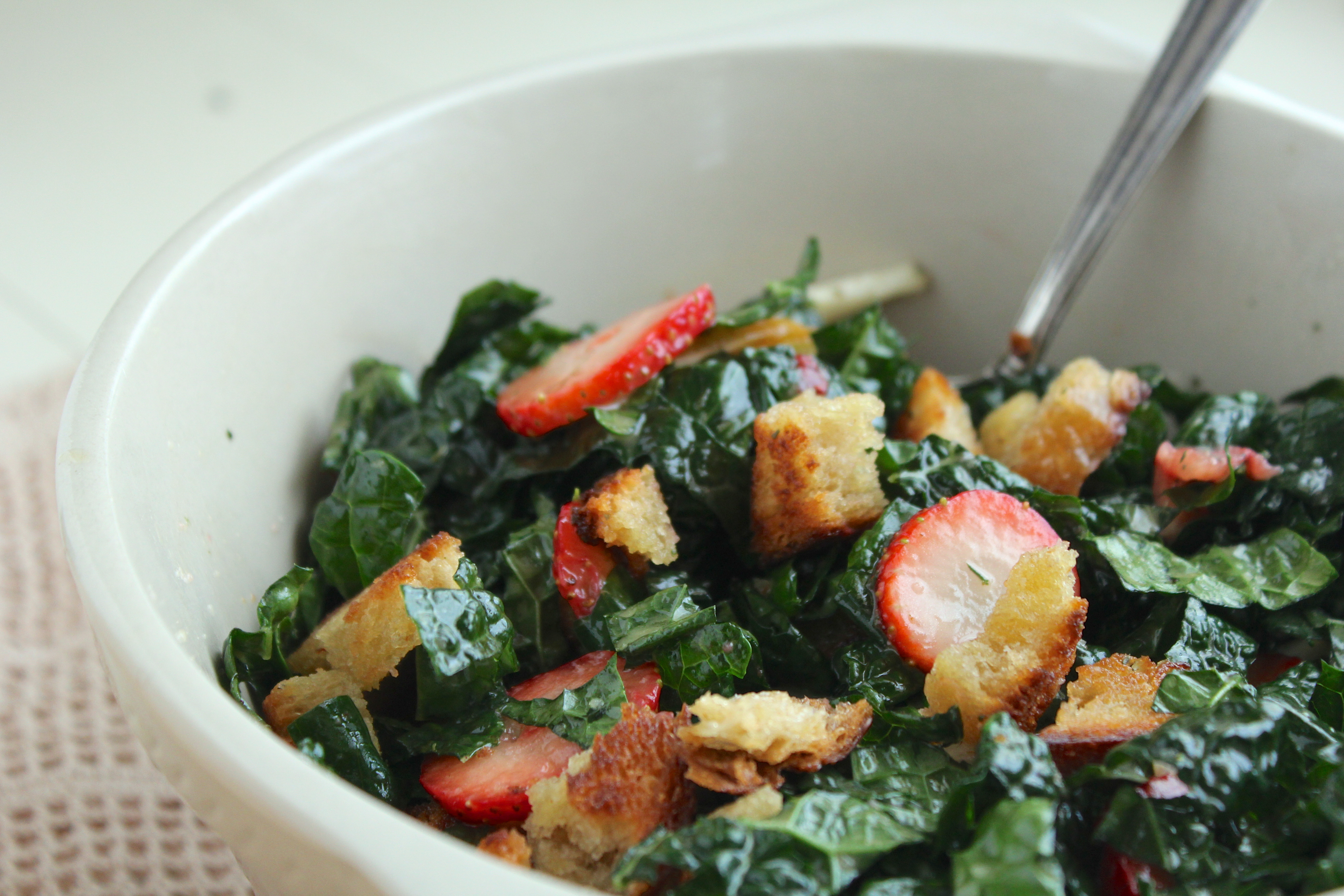I’ve been really into incorporating fruit into my salads of late, and this Kale, Strawberry & Pear Salad is my new favourite. W has been crazy for strawberries lately, so when we got a great big punnet my first thought was how well they’d go in a kale salad. The lemon thyme dressing is one that I’ve made before – and love – and thyme just goes so well with strawberries that it was a no-brainer. In the end, this combo was perfect; the slightly bitter taste of the kale and sourness of the lemon offsets the sweetness of the fruits. You could forgo the sourdough croutons, but the toasty crunch really took this salad up a notch, and made it that much more satisfying. In fact, I liked this salad so much that I ate THE ENTIRE BOWL in one sitting. Oooh yeh.
