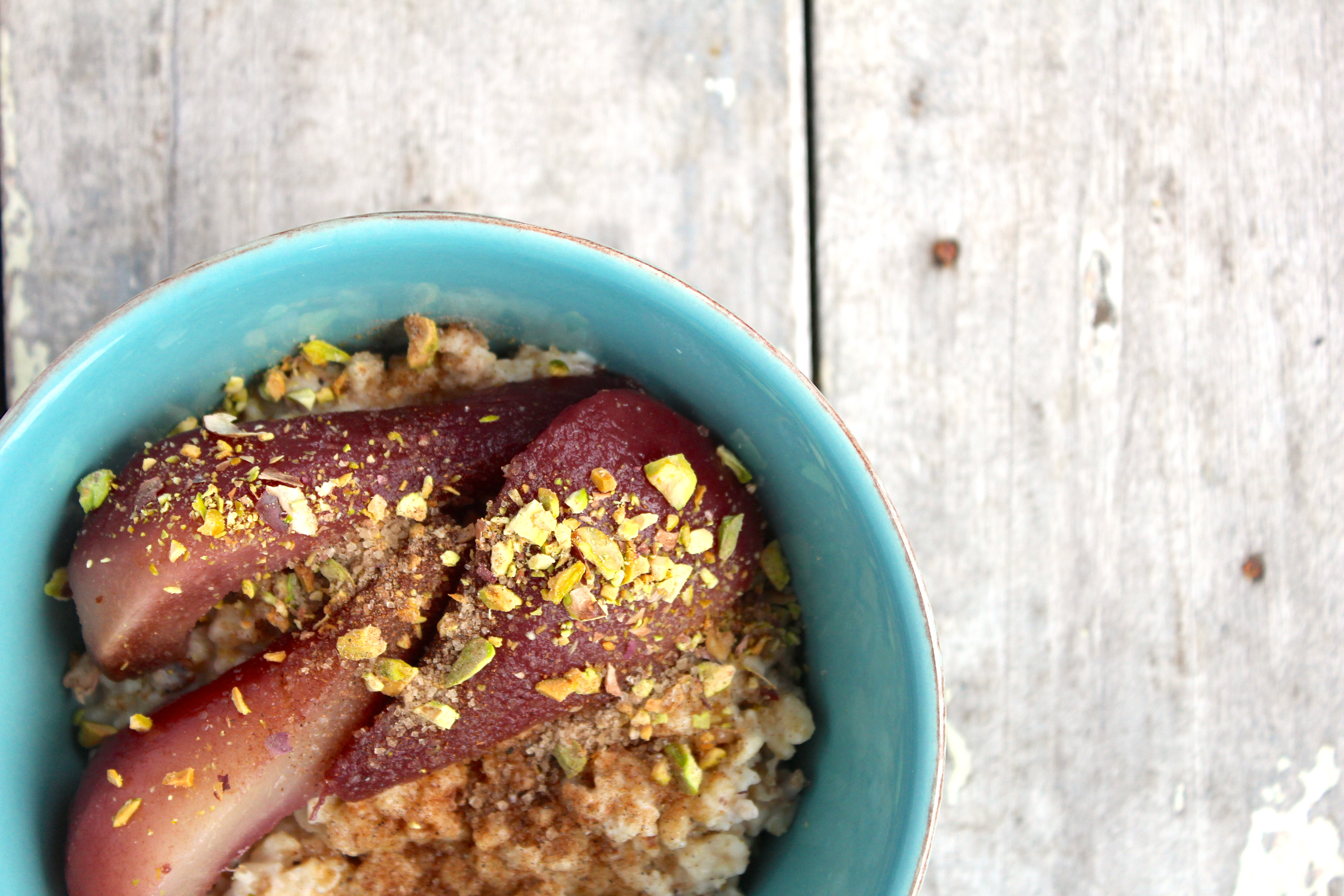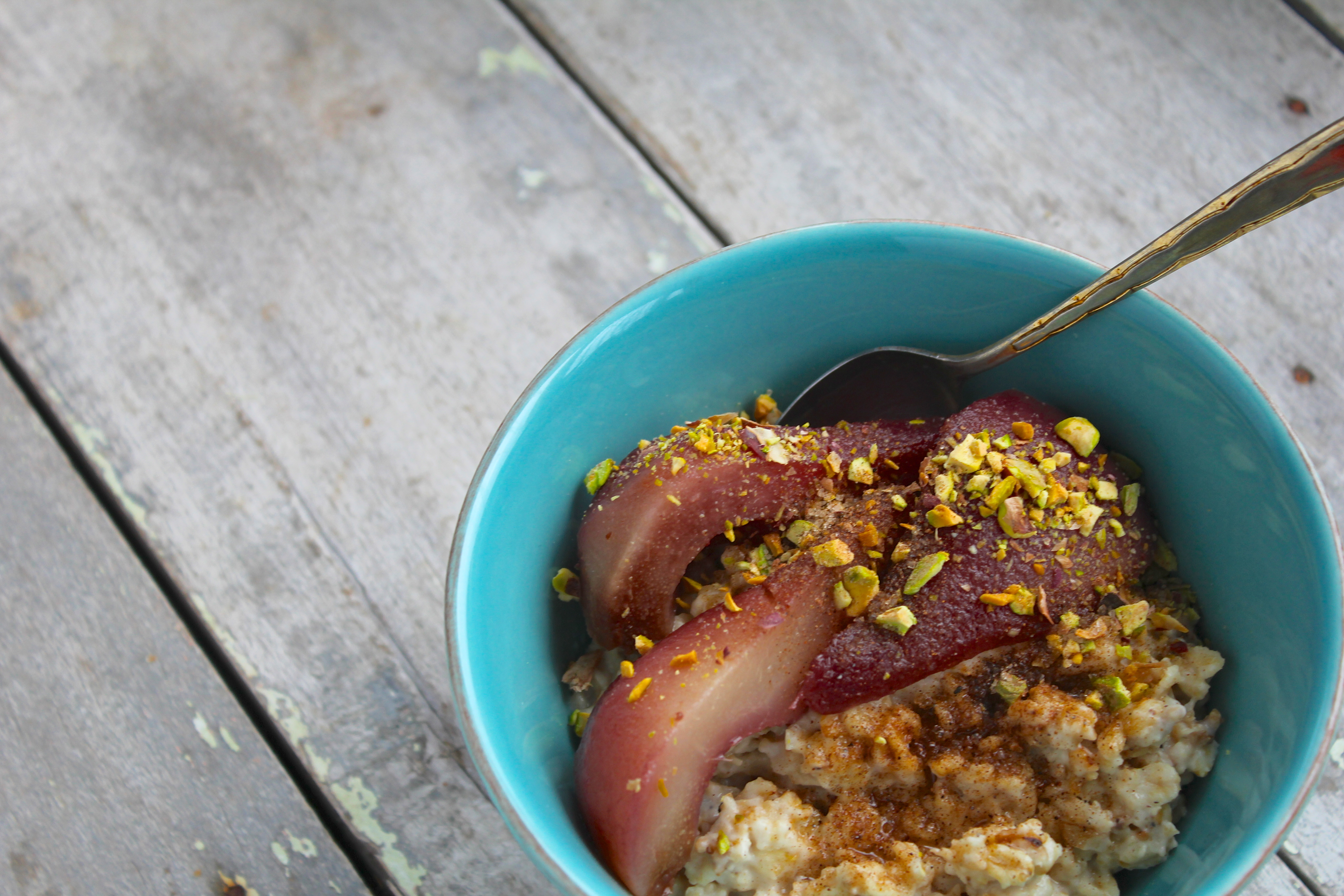 Notes: I like to use almond milk in my porridge, but really any milk will do. With the pears, make sure you choose ones that are ripe but still firm; if they’re too soft they’ll fall to mush while poaching. As for red wine, use whatever you have on hand – and save the rest to drink later on with dinner.
