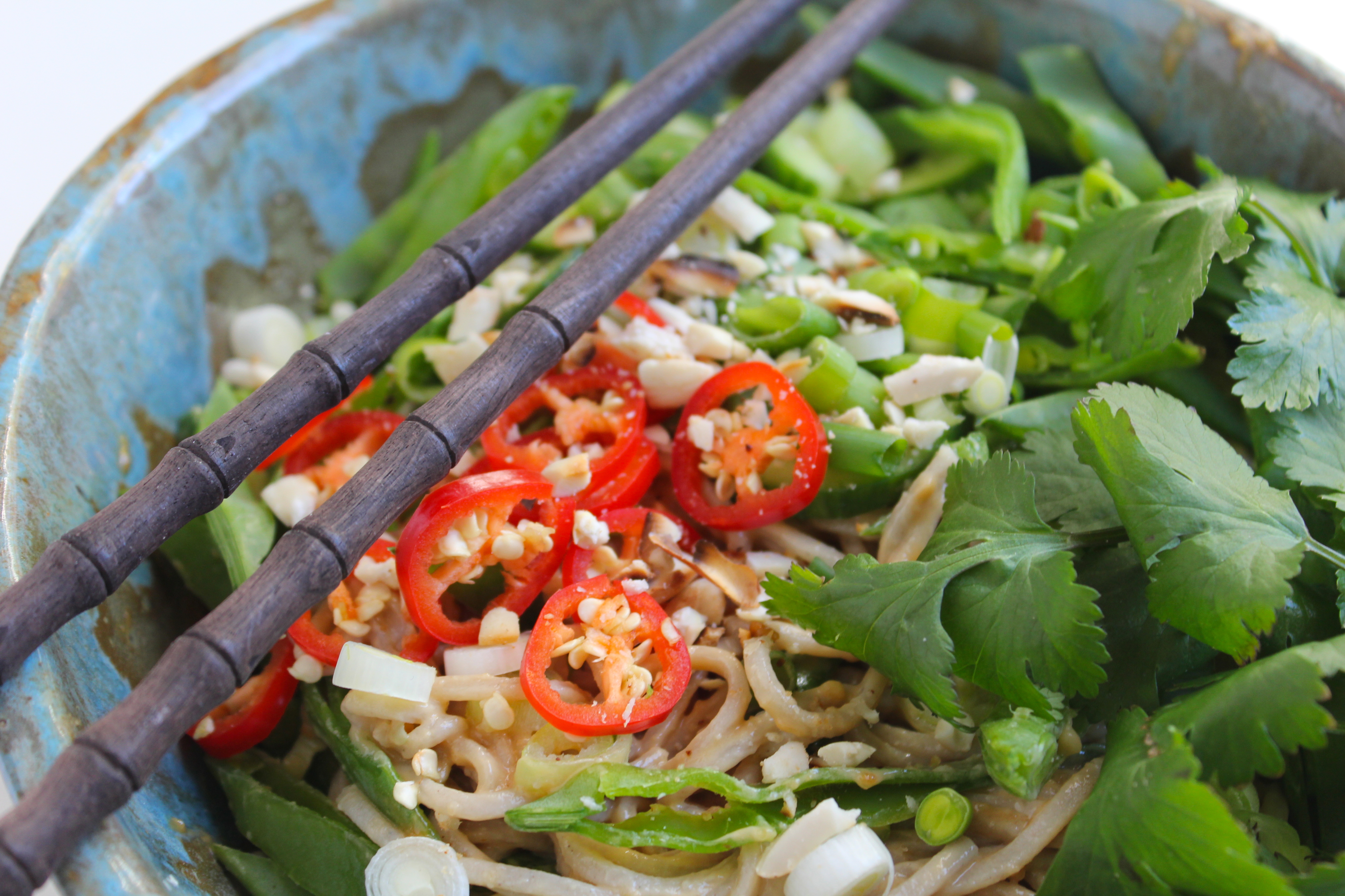 This Peanut Soba Noodle Salad is my kind of meal. It is easy to put together, healthy, and – the most important component – super tasty. I cook a variation on this quite regularly for dinner when we’re tired and looking for something light and easy. Anything with peanut butter in it wins me over, but what I love about this salad is how the creaminess of the peanut sauce is offset so perfectly by the fresh crunchy veges and the nutty soba noodles. If you’re looking for some extra protein, a few slices of grilled tofu go sublimely with this salad. Either way, this is the kind of meal that can do no wrong.