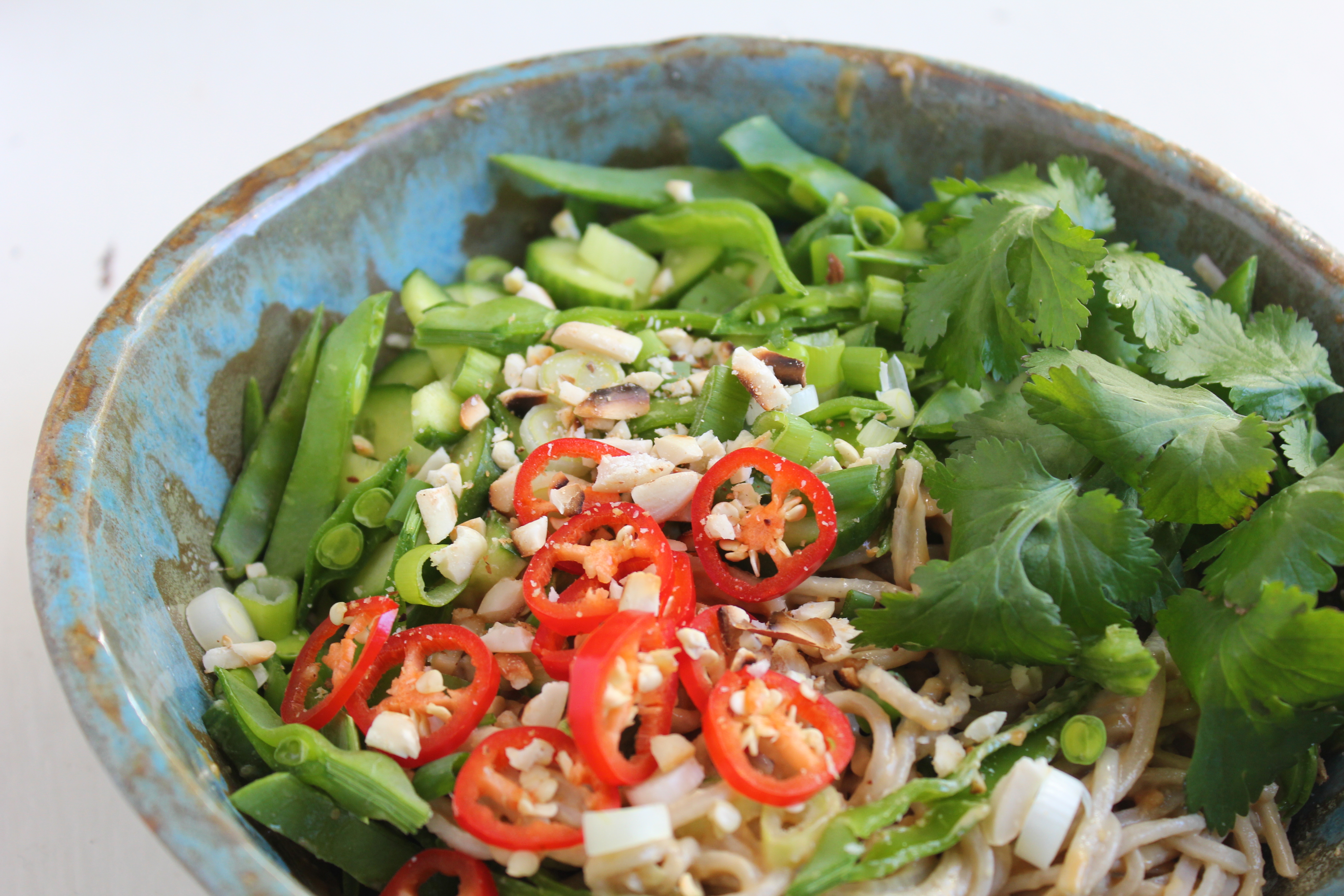 When the soba noodles are ready, rinse them under cold water. Dish them evenly into two bowls, halve the peanut sauce across both bowls, and mix thoroughly through the noodles. Top with the chopped veges, finishing with the coriander, sliced chillies, and a scattering of crushed peanuts.