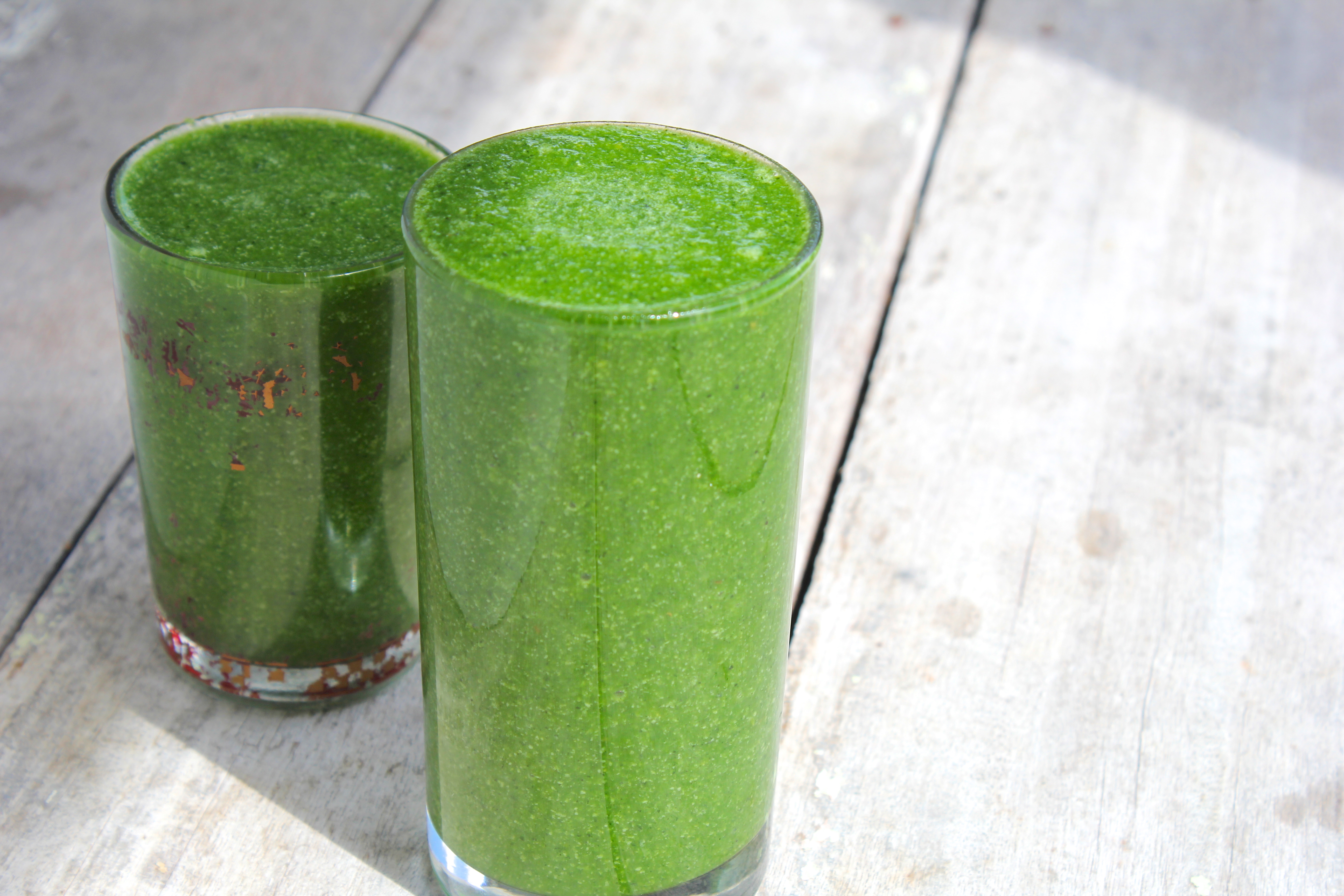 Maybe it is my imagination, but I feel like our homegrown spinach is just, well, better than the stuff we buy from the market. The leaves are almost plump, juicy and full of flavour. Mostly I have it chopped up in a lunchtime salad, but a green smoothie is easily the best way to showcase fresh leafy produce.