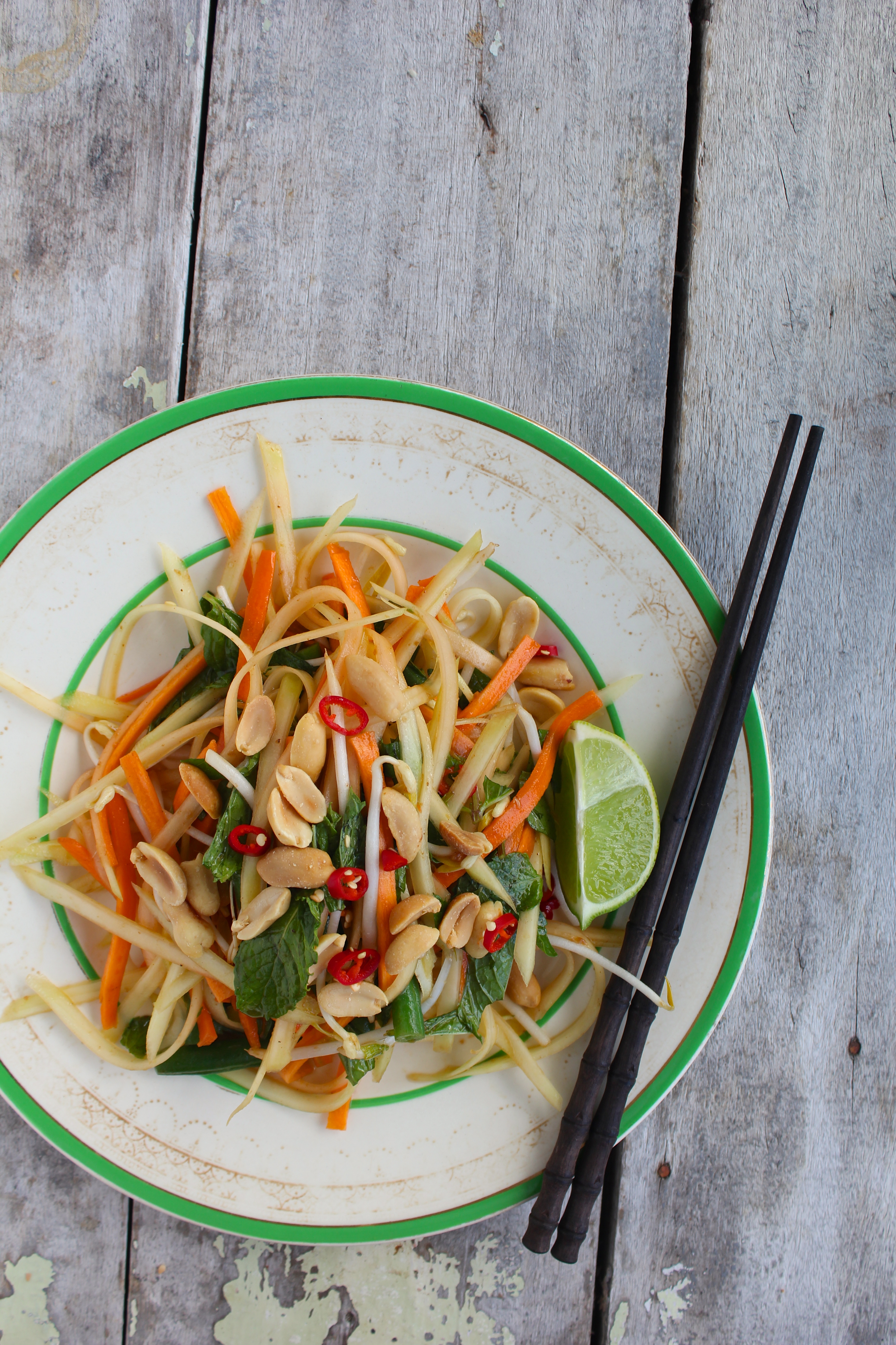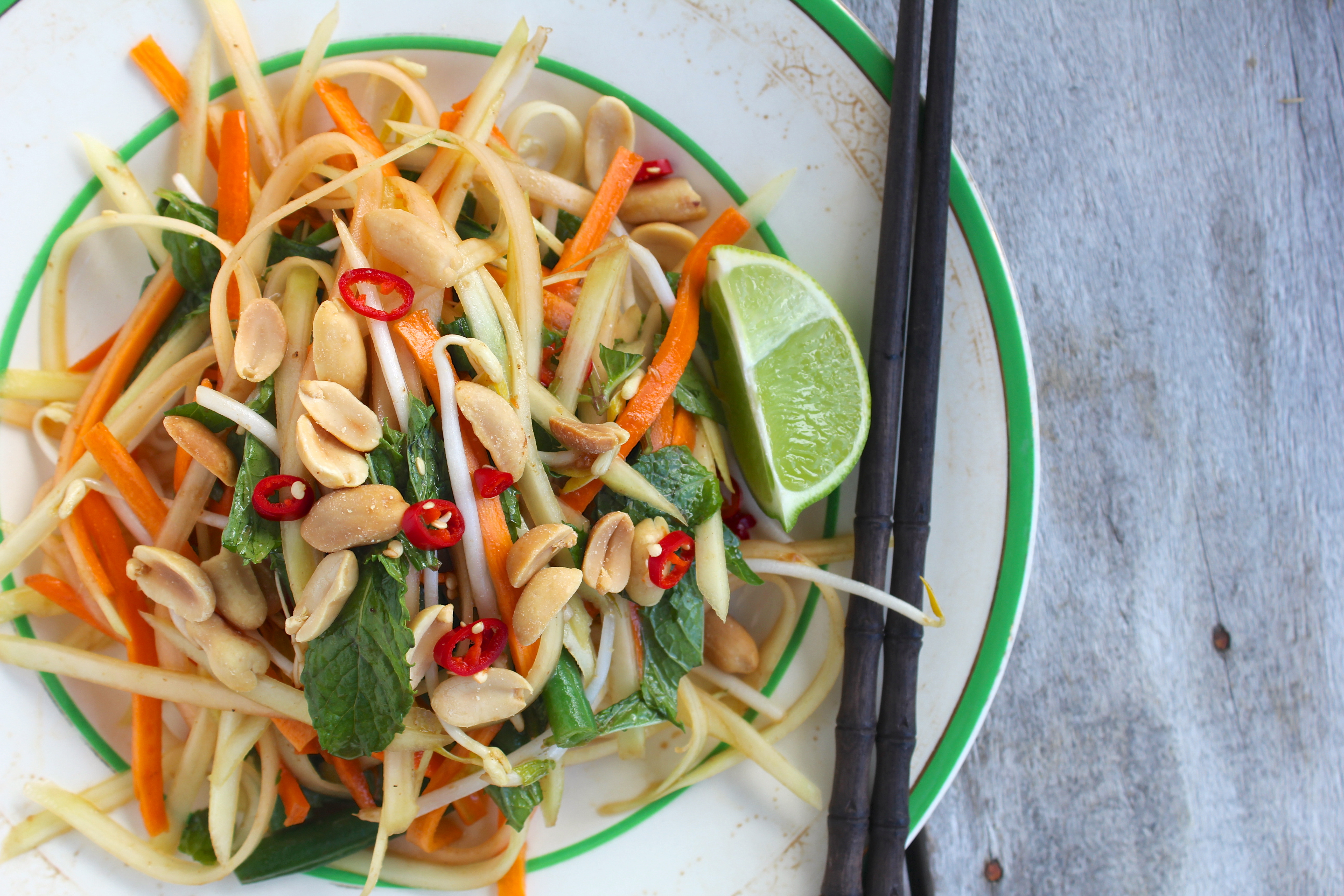 So to keep the sunshine alive in the midst of all this rain, Green Papaya Salad. This is one of my most favourite Thai dishes. It is simple and full of bold flavours. The spicy kick of red chilli, the sweet-sour of the tamarind sauce. It is also wonderfully textured and crunchy, with bright colours to keep things pretty.