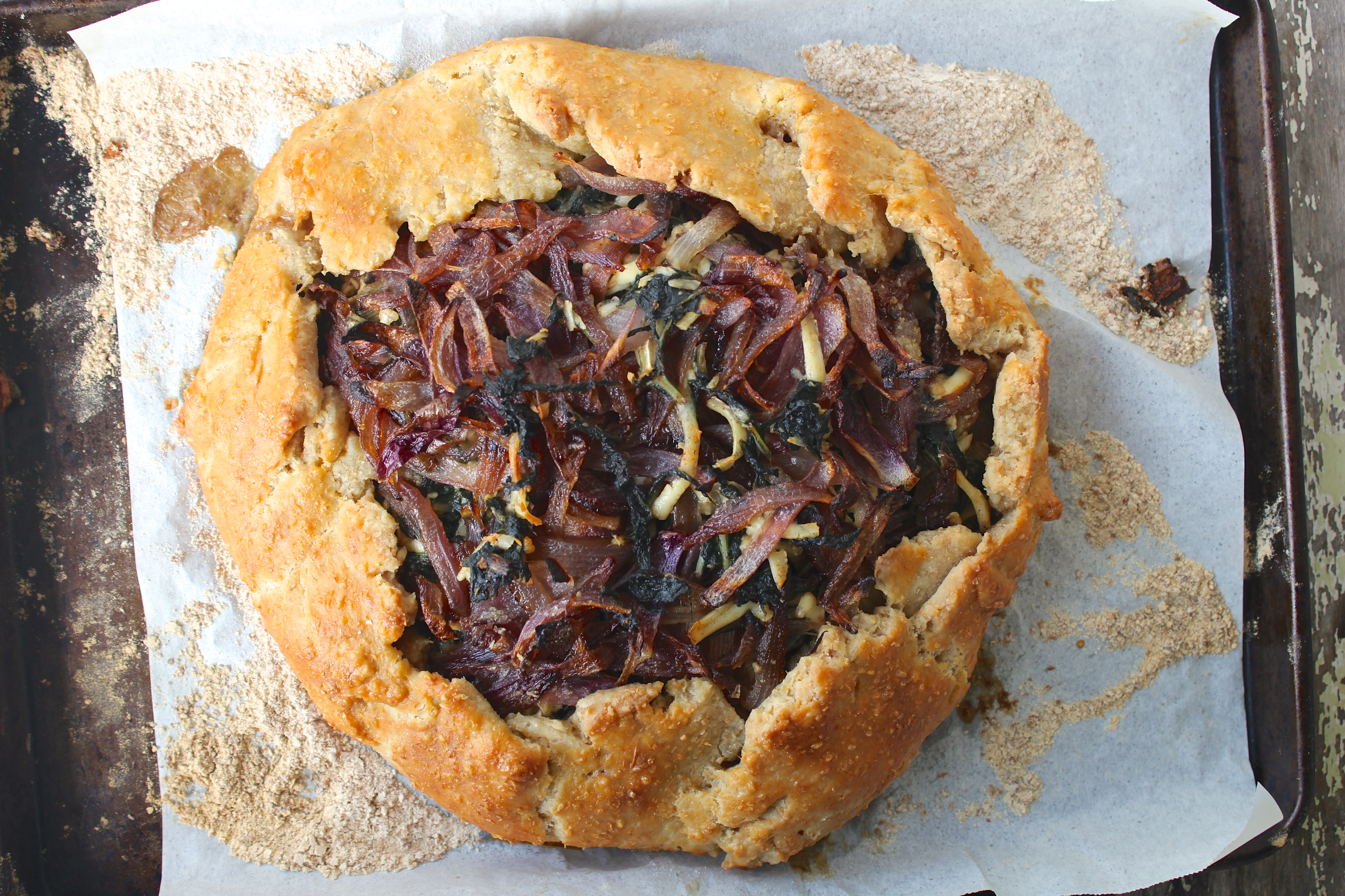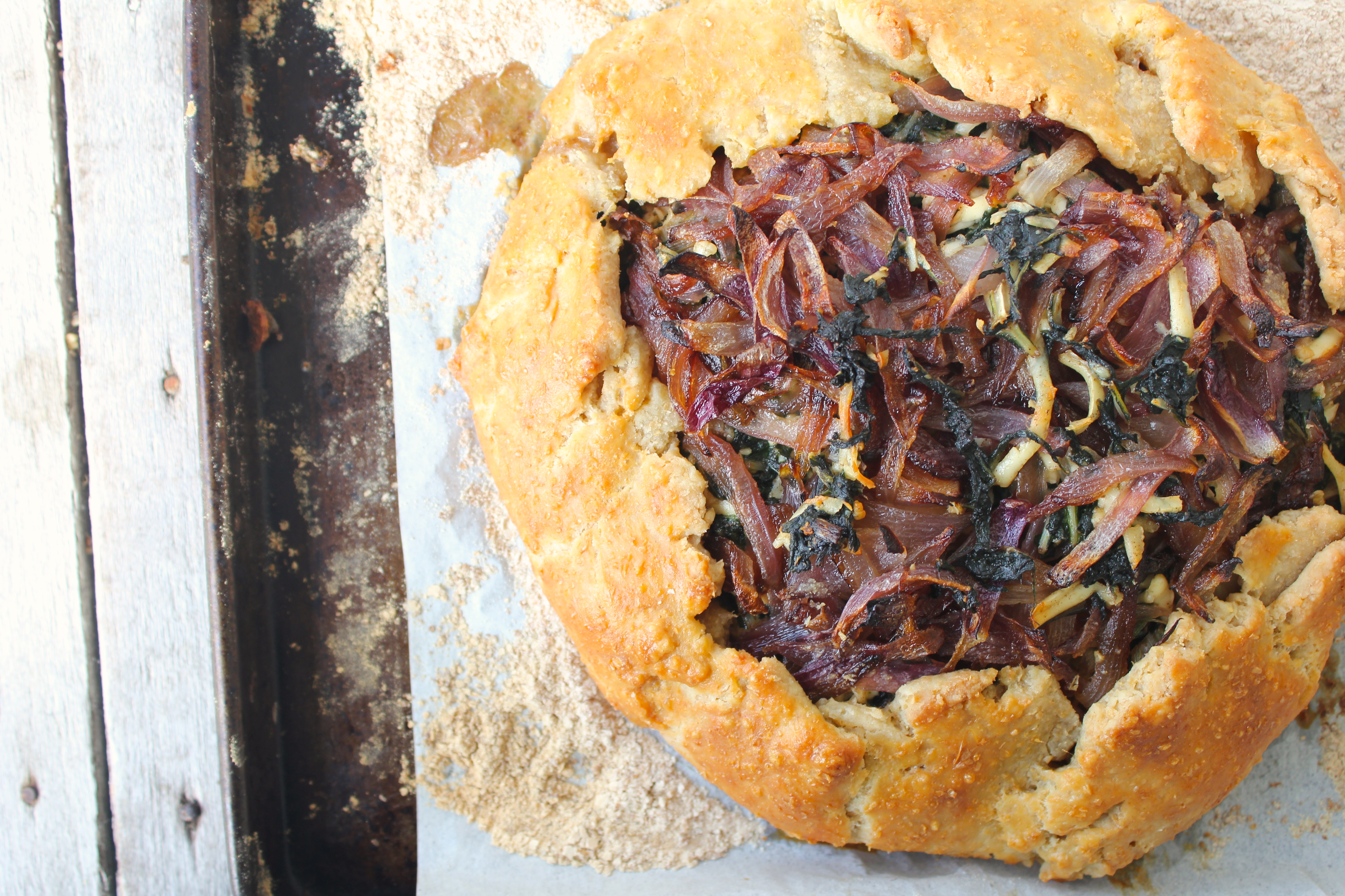 When you’re ready to start assembling the galette, preheat your oven to 200° celsius/400° fahrenheit. On a floured bench roll out the dough into a circle (approx. 30cms). Pile the silverbeet/haloumi mixture into the middle, leaving a border of about 4cm all around. Place the onion over the top. Fold the border over the mixture, pleating as you go to make it all fit in.
