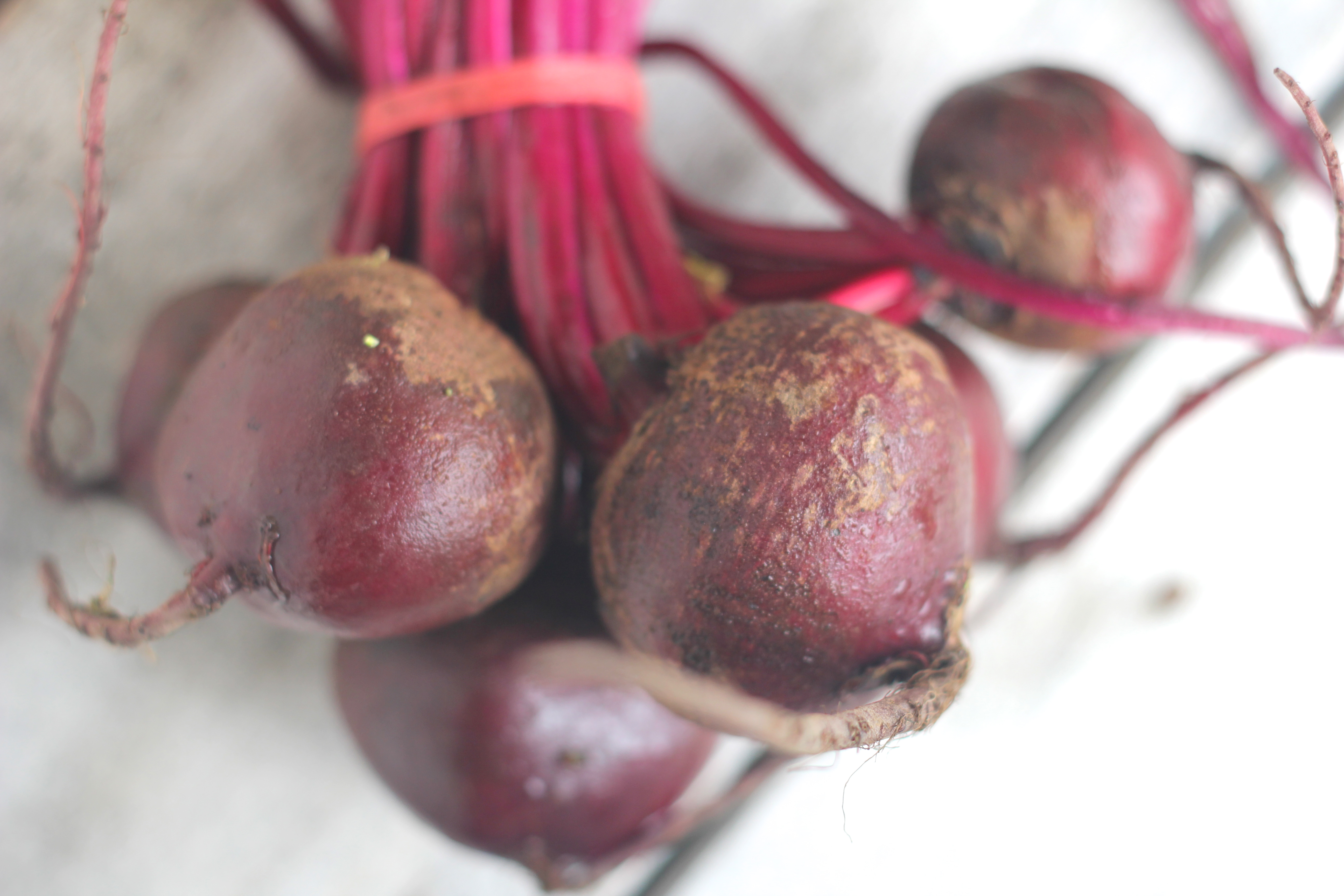Remove the green tops from the beetroot and cut into quarters (or halves, if your beetroot are especially small). Toss the beets with a glug of olive oil, a sprinkle of salt & pepper, lay in a single layer on a baking tray and roast for 30 – 40 minutes, until tender and beginning to crisp.