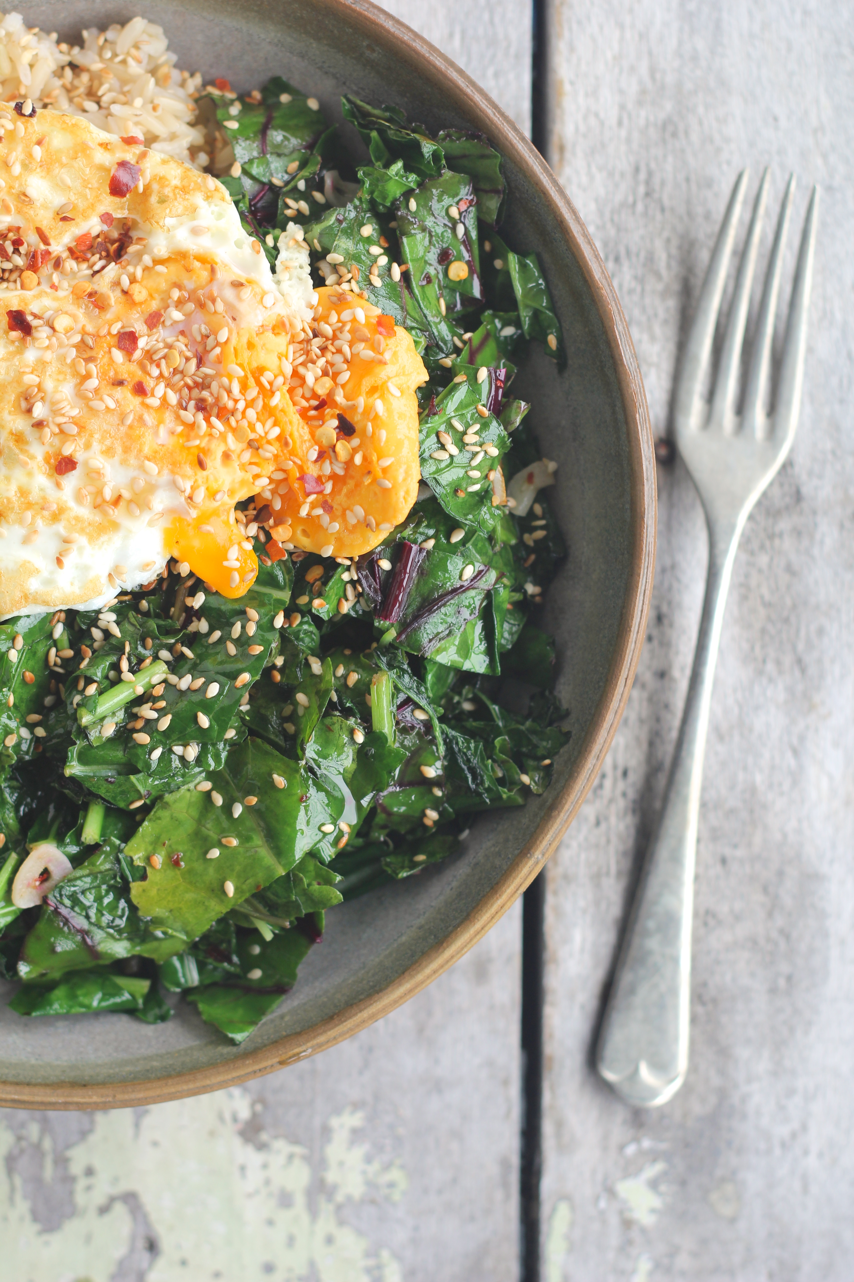 Transfer your cooked rice to a bowl and drizzle with sesame oil. Top with the greens and fried egg, and sprinkle with the toasted sesame seeds (if using).