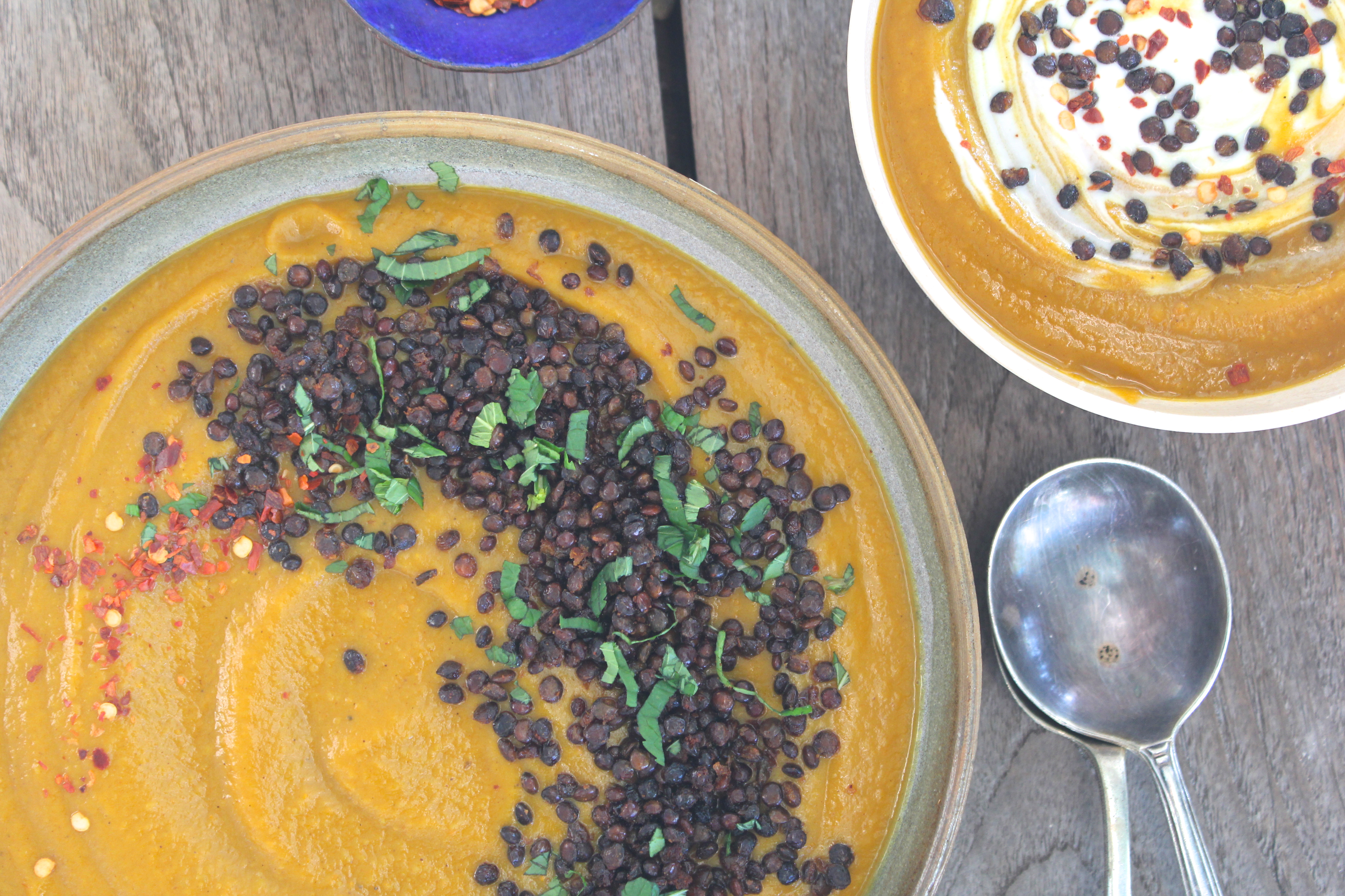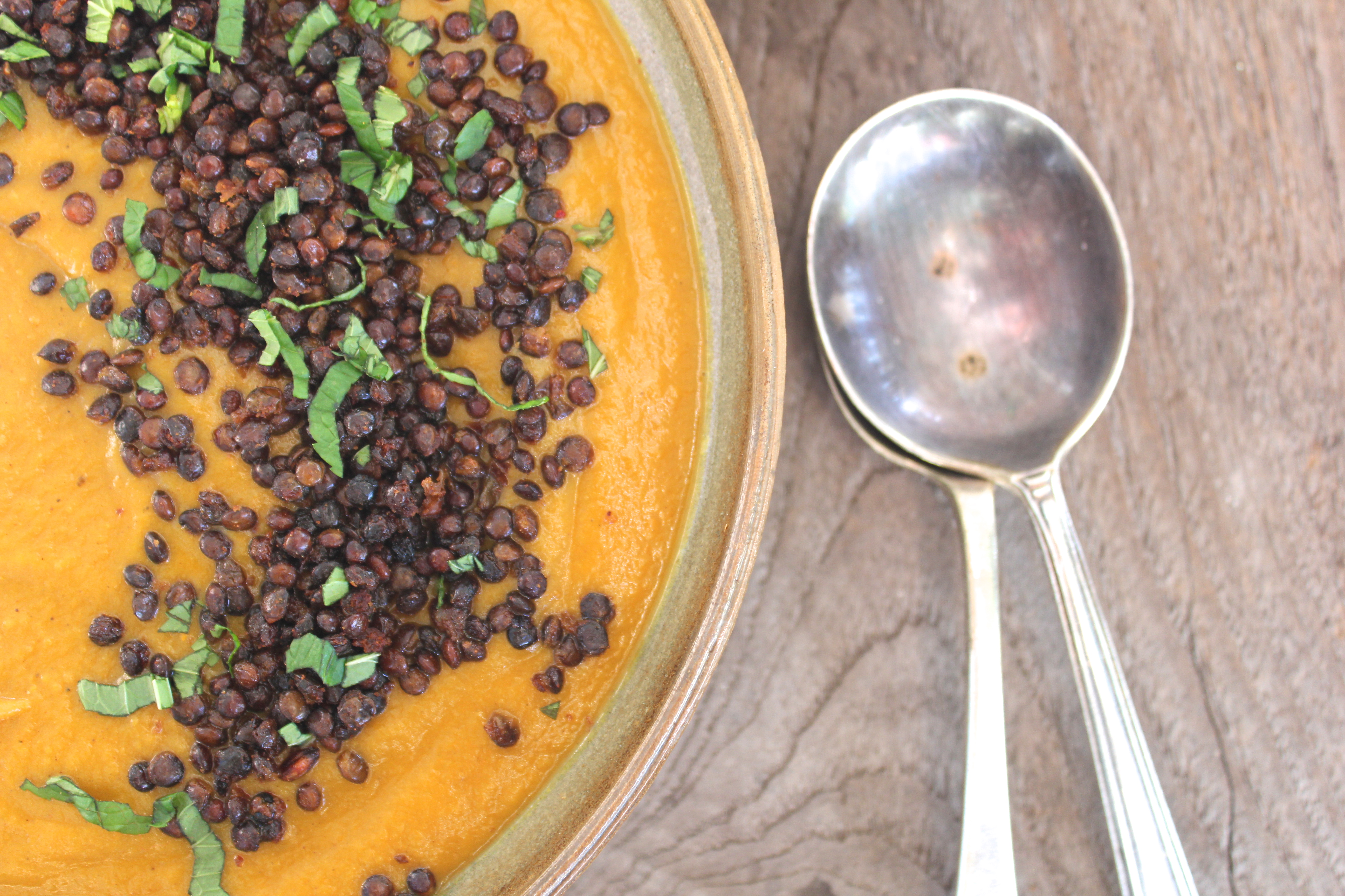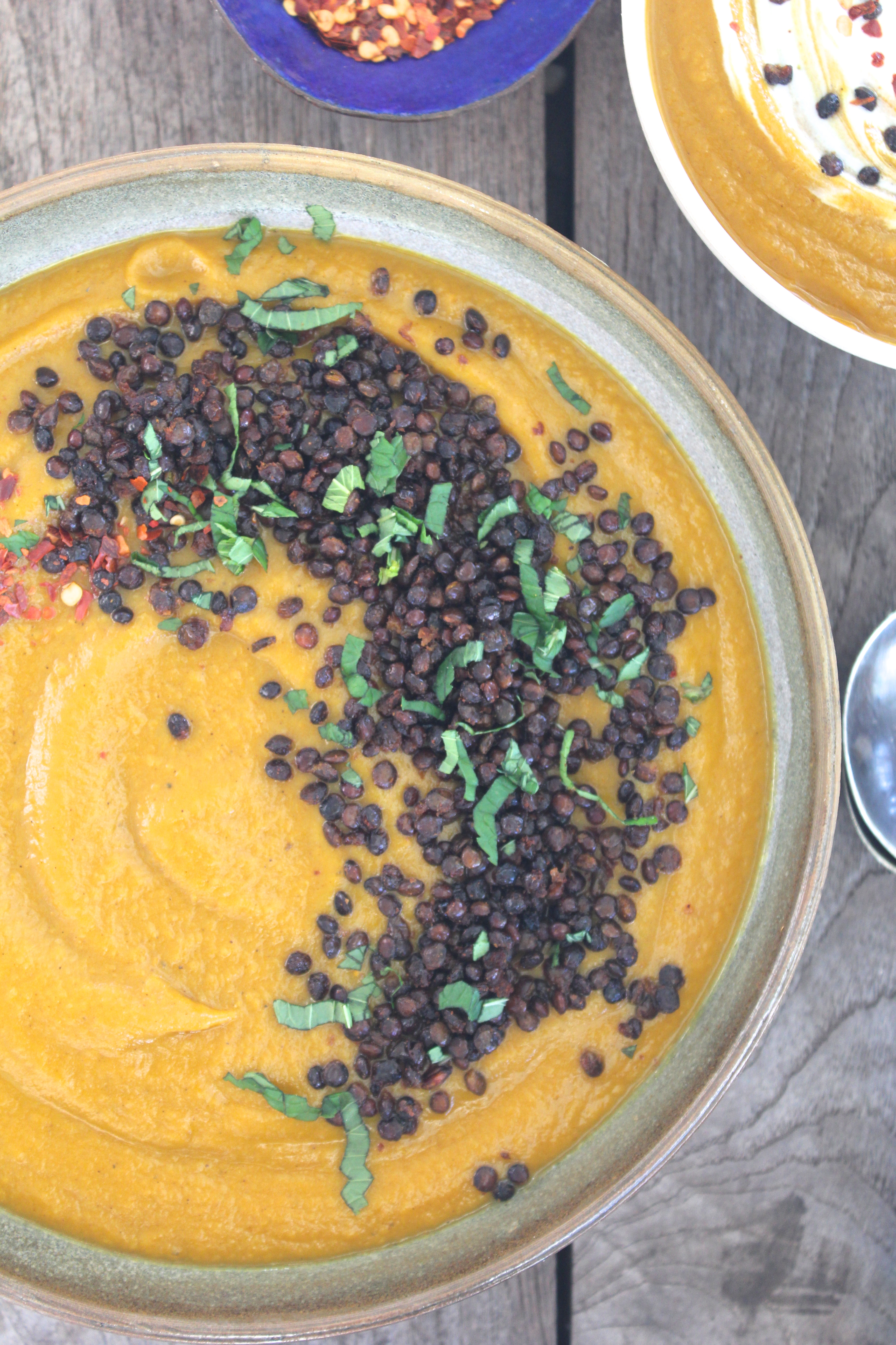 Roasted Sweet Potato & Turmeric Soup with Crispy Lentils
