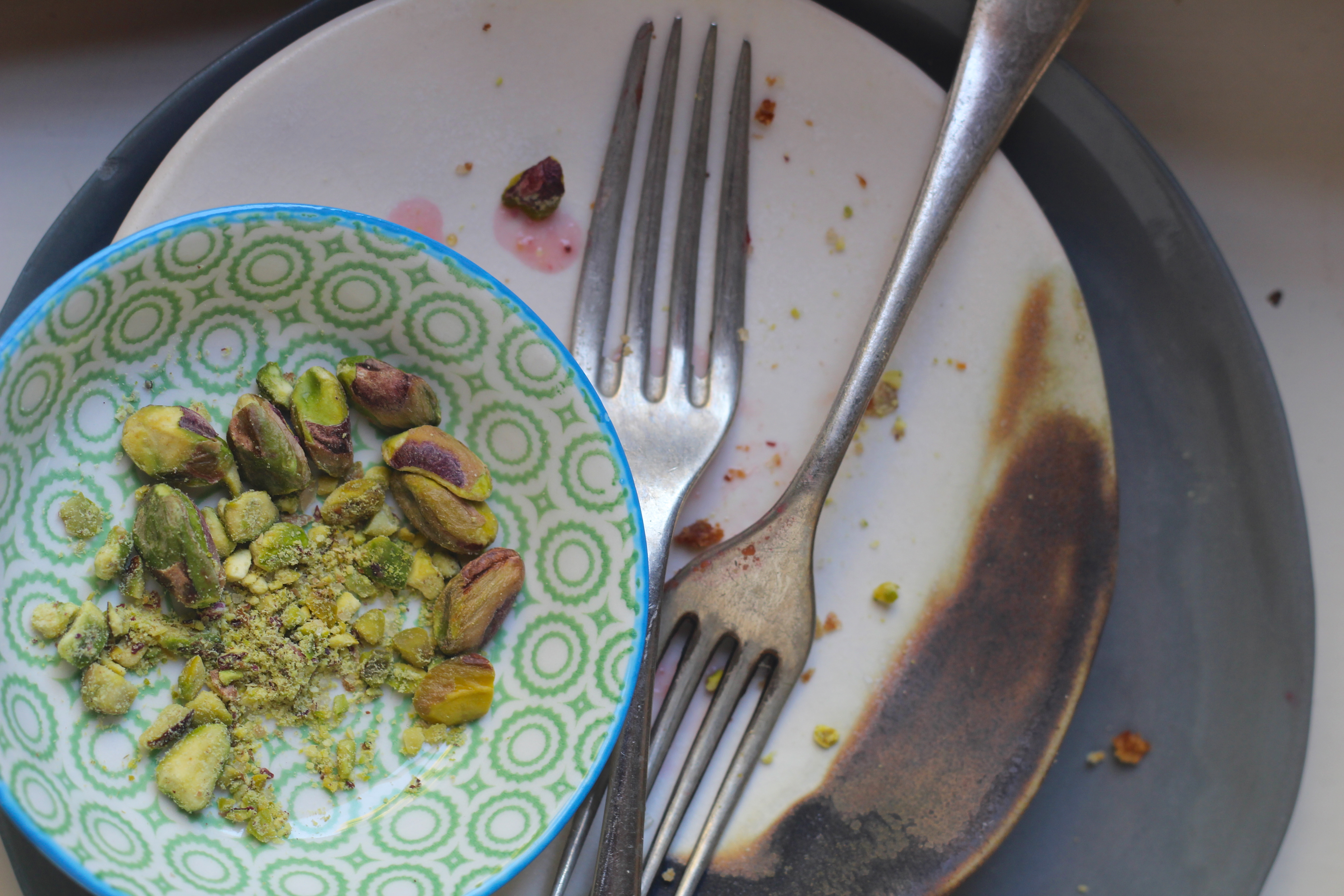 Start by preparing the pastry. Using either a food processor or a mortar & pestle, grind the pistachio nuts to a rough crumb. Combine the flour, ground nuts, and salt in a large bowl. Cut the butter into chunks and using either your fingertips or a pastry cutter work through the flour until it resembles coarse breadcrumbs (a few larger chunks of butter are fine). Combine the yoghurt and water and add to the flour mixture, using a wooden spoon to mix until just combined (don’t overmix). Use your hands to form a small disc out of the flour, cut the disc into four pieces, wrap each piece in plastic, and pop in the fridge for at least 1 hour, up to overnight.