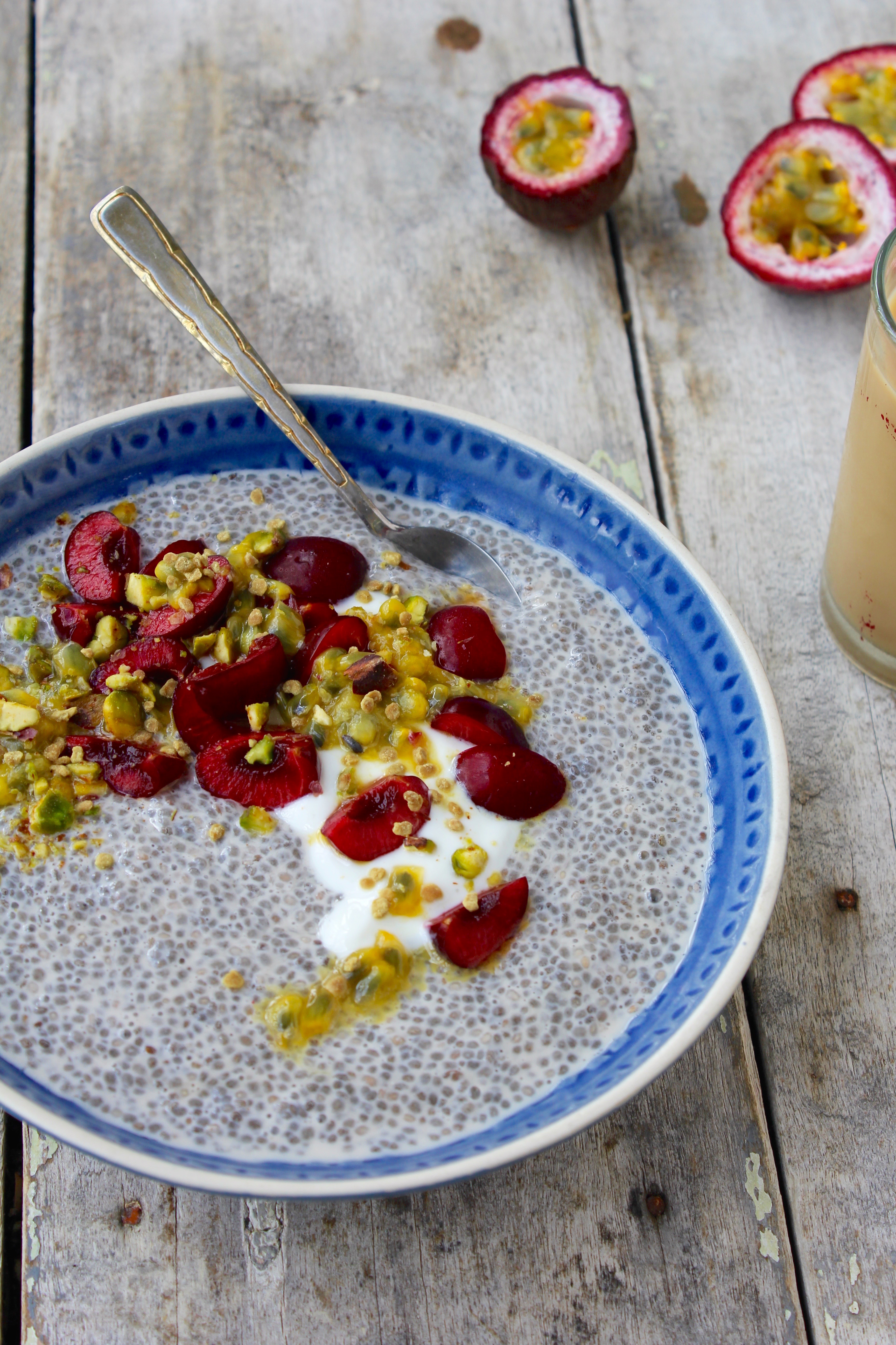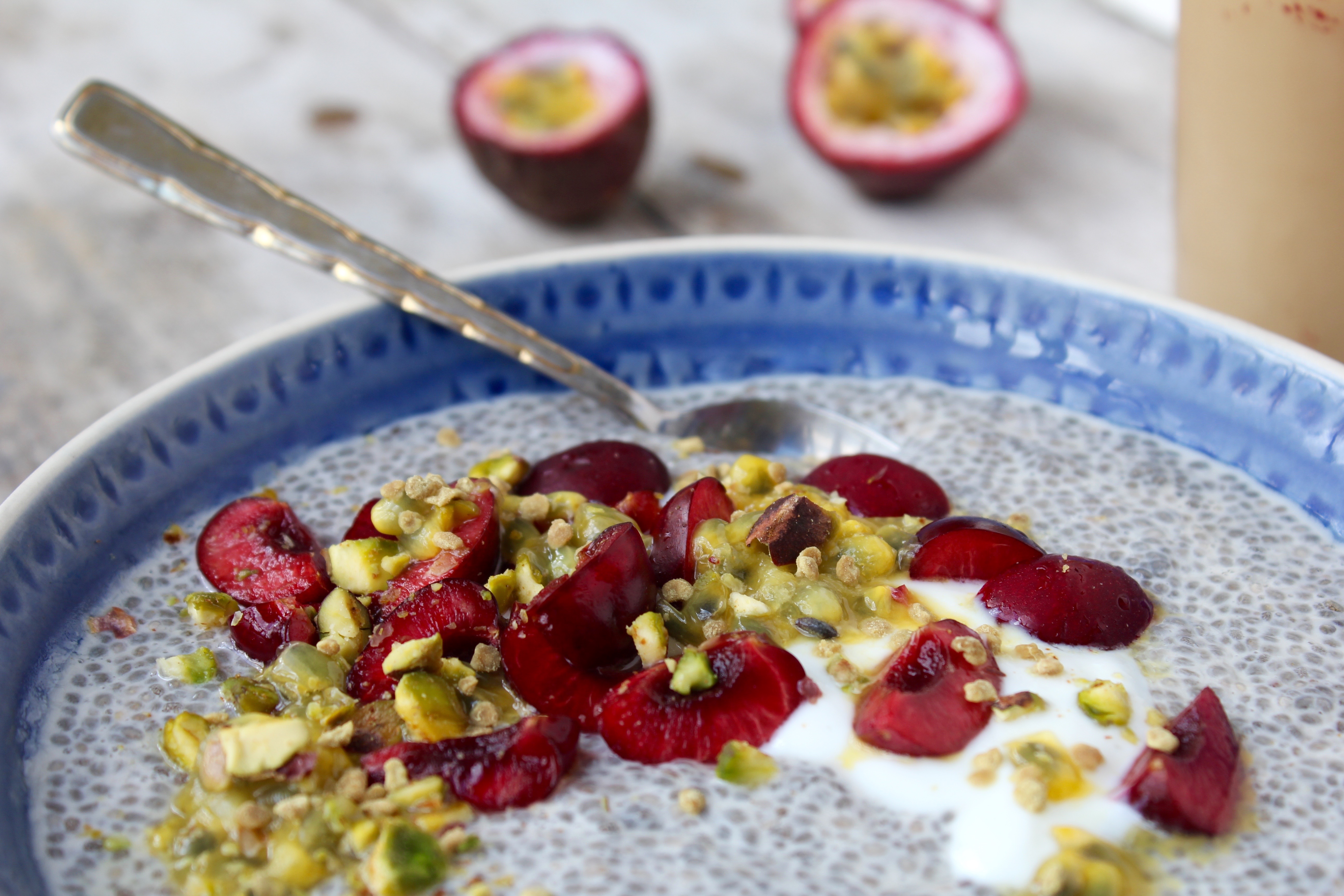 When ready to serve, top with a dollop of coconut yoghurt, a handful of (pitted) cherries, pistachios, bee pollen and passionfruit.