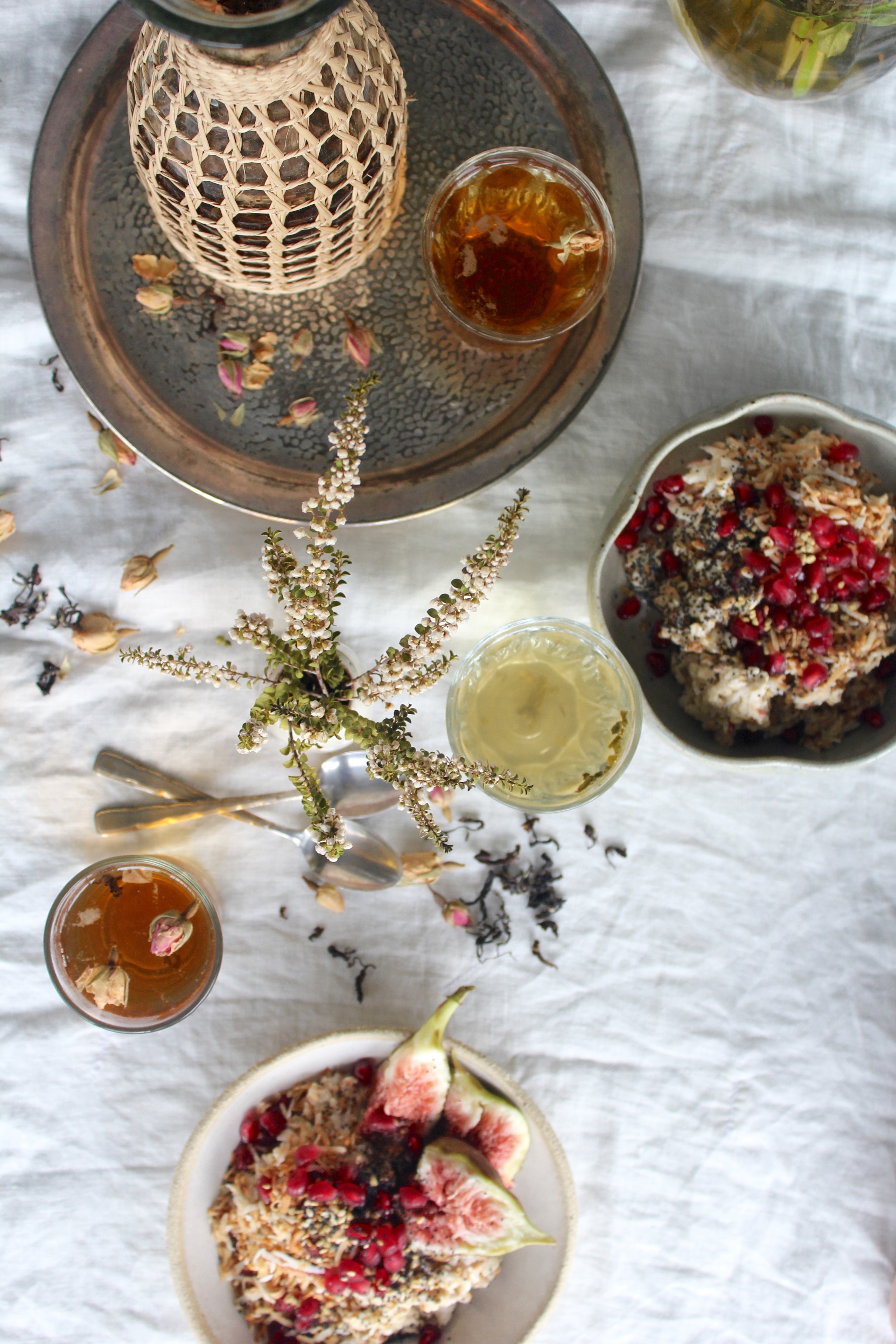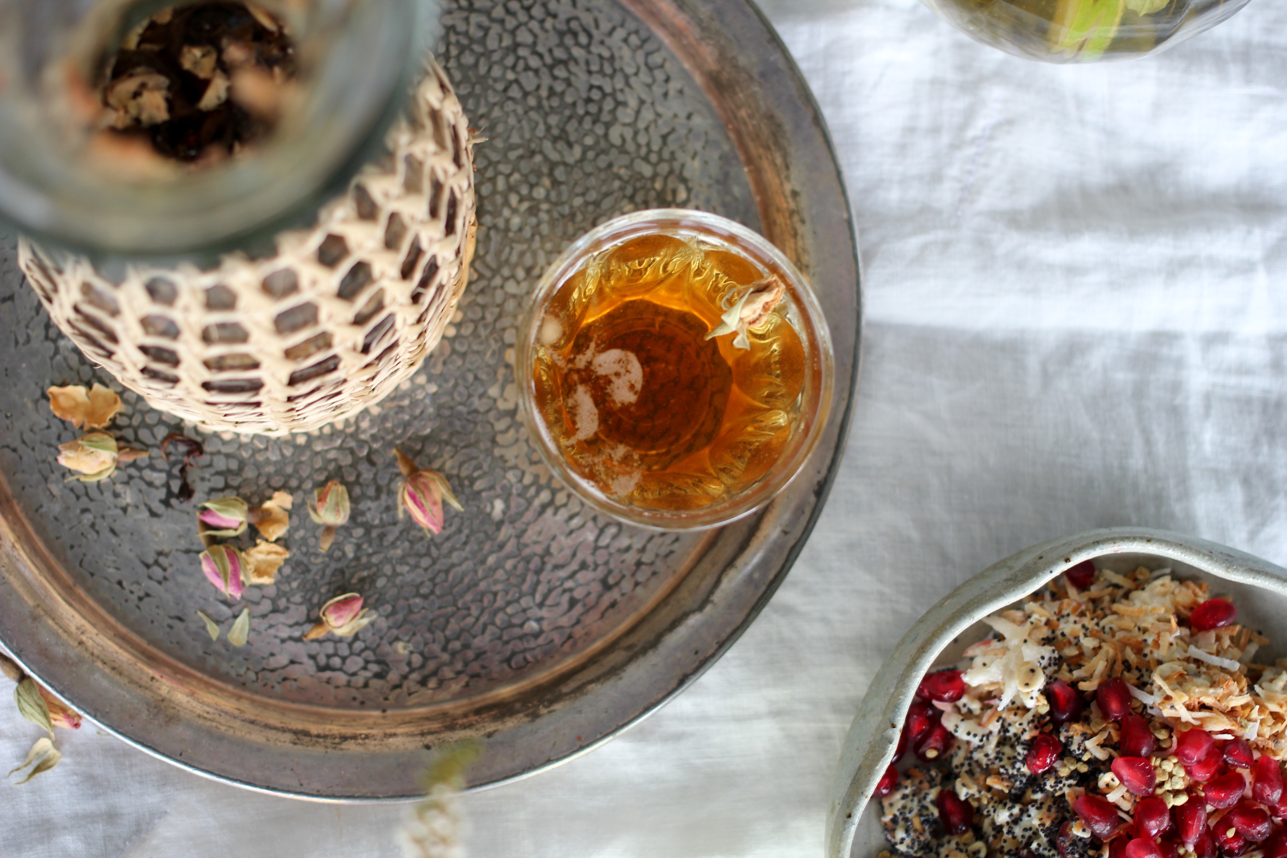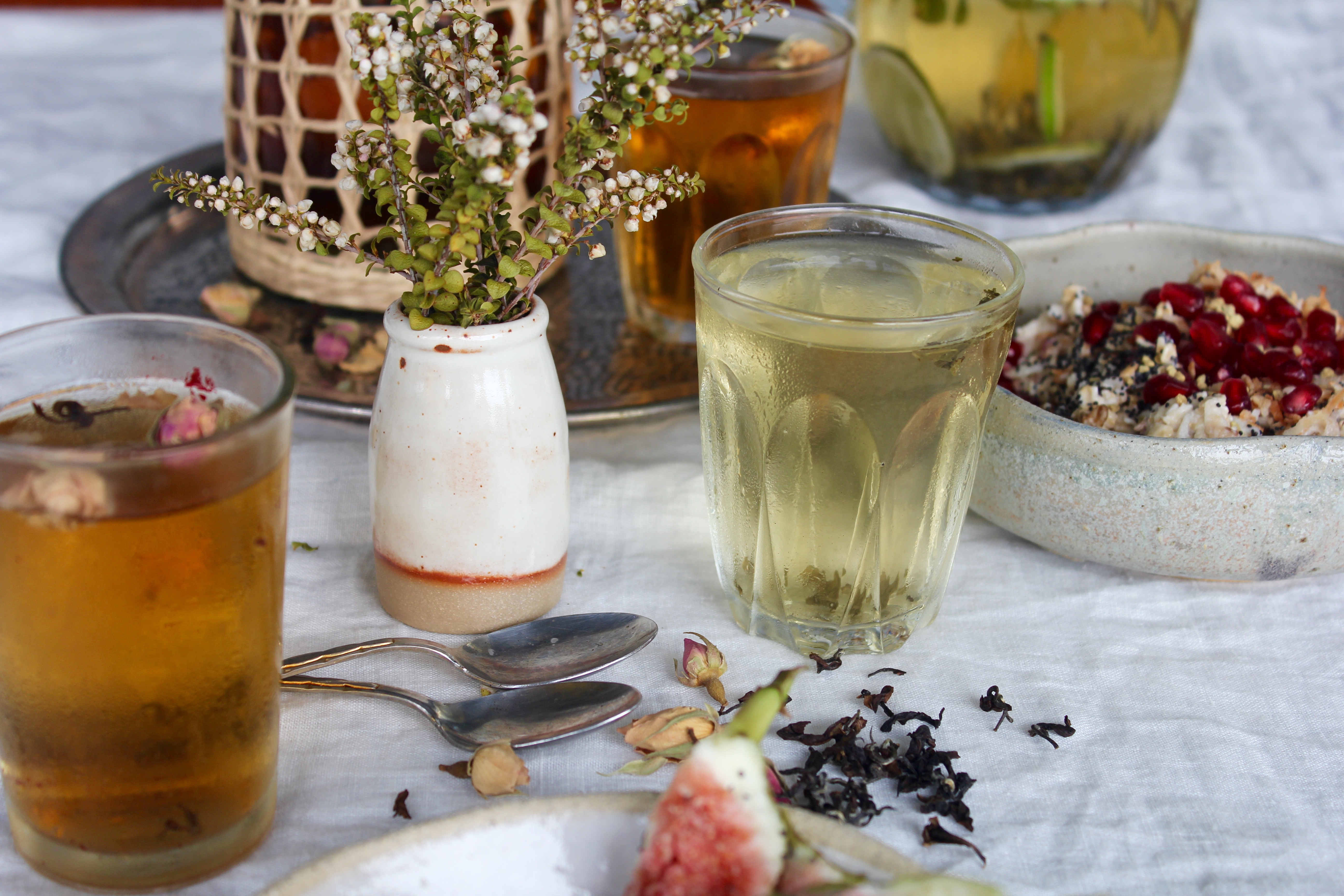 Unwilling to relinquish my tea-drinking ritual despite the heat, I’ve taken to making Iced Tea instead. These cold brewed iced teas are a totally different beast to the sickly sweet fruity stuff they sell in plastic bottles from corner stores. Cold brewing the tea overnight draws out the flavours of the tea without the bitterness of the tannins. In place of sweet fruit flavourings, I opt for the peppery hint of basil, the subtle perfume of rose. If you do prefer it a little sweeter, go ahead and serve with a drizzle of honey. Either way, these two cold brewed Iced Teas – Oolong & Rose, and Green Tea with Lime & Basil – are both beautifully refreshing.