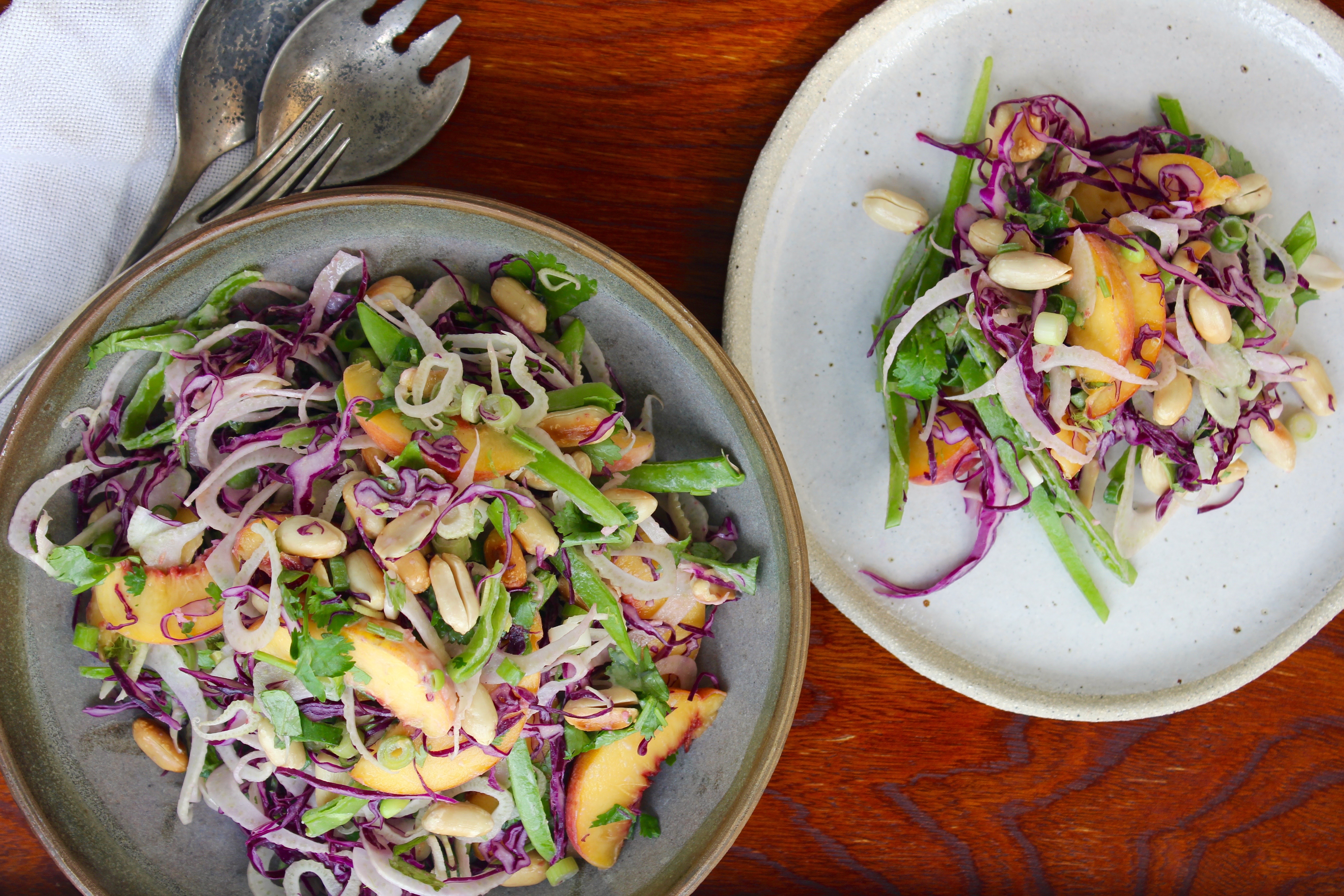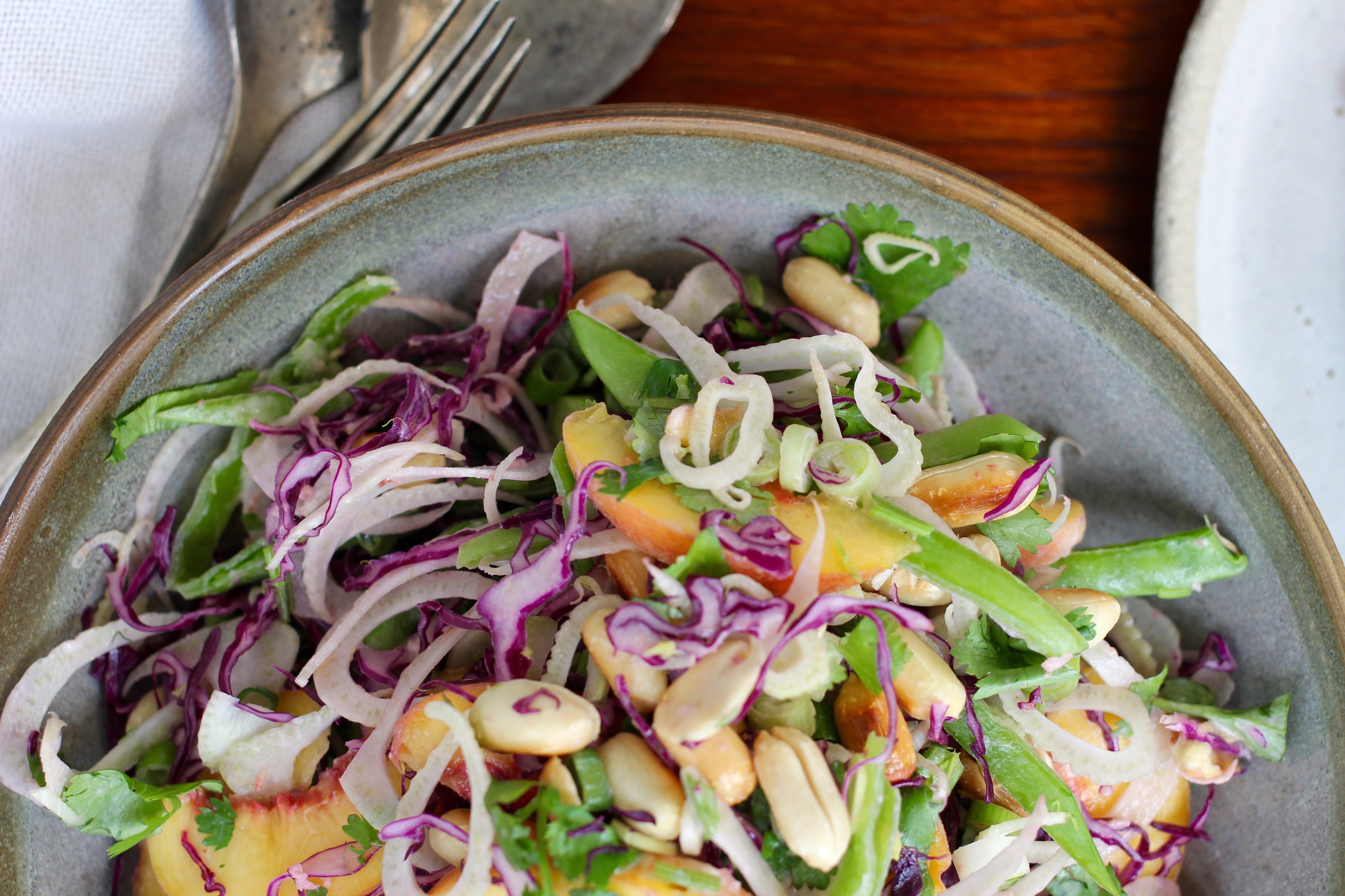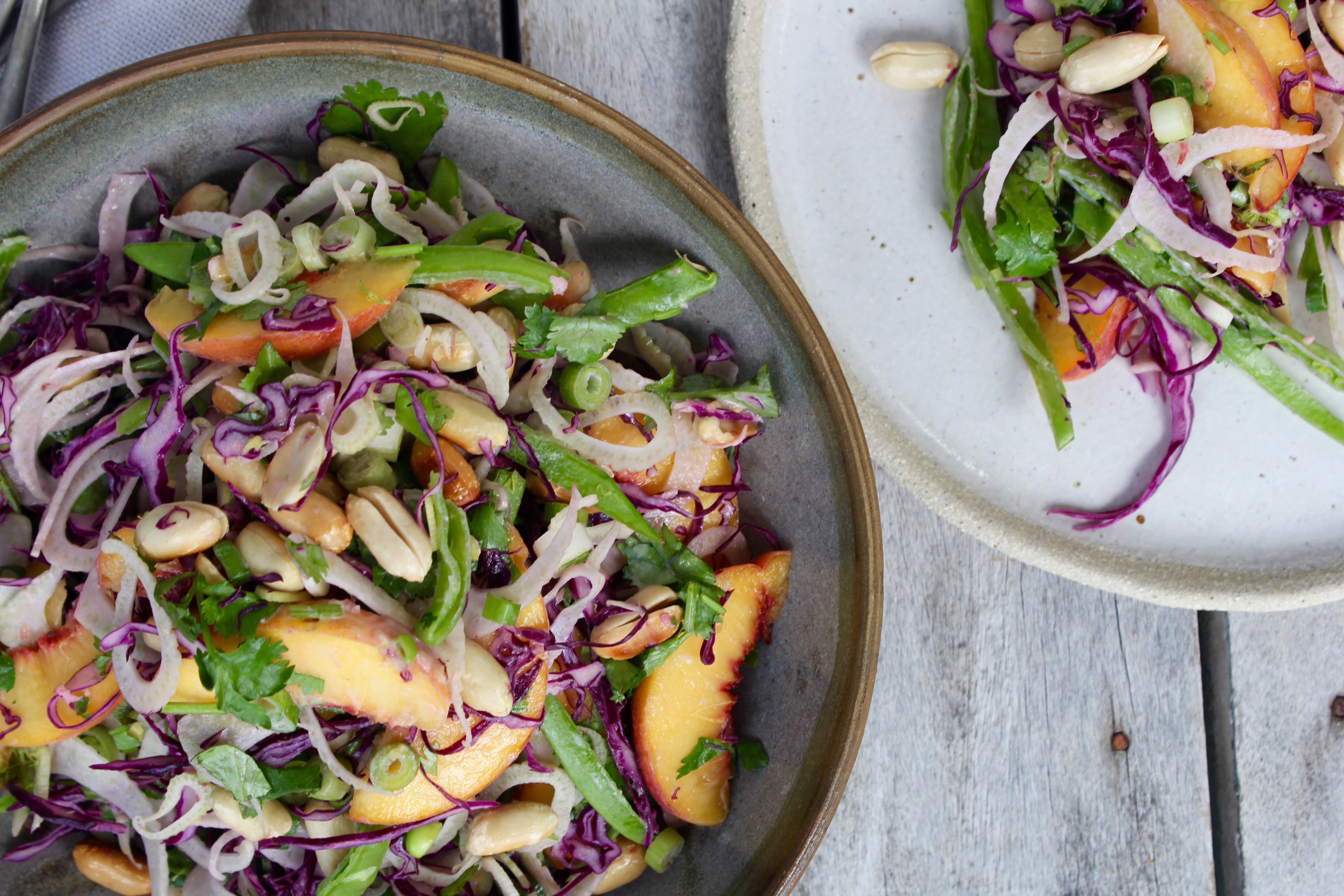 Using a mandoline (or a sharp knife and your mad cutting skills), finely shred the fennel and the purple cabbage. Remove the tops of the snowpeas and slice vertically into long strips. Thinly slice the spring onion, both the white and red parts. Halve and pit the peach then thinly slice. Roughly chop the coriander.
