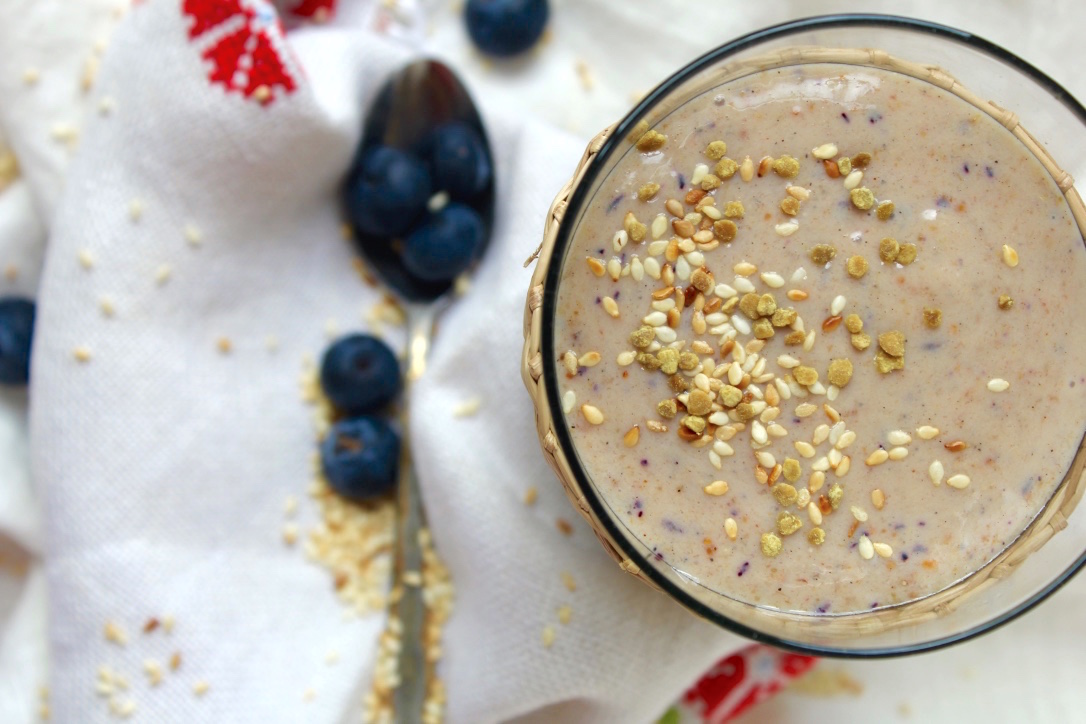 This is my new favourite smoothie combo. Tangy, not too sweet, with a Persian flavour twist. Plus toasted sesame seeds in smoothies are amaze! Like all smoothies, it’s easily adaptable. If you don’t have frozen bananas use fresh ones and throw in a few ice cubes too. Replace the blueberries with strawberries if that is what you have on hand, and I imagine that a teaspoon of rose water wouldn’t go astray here.