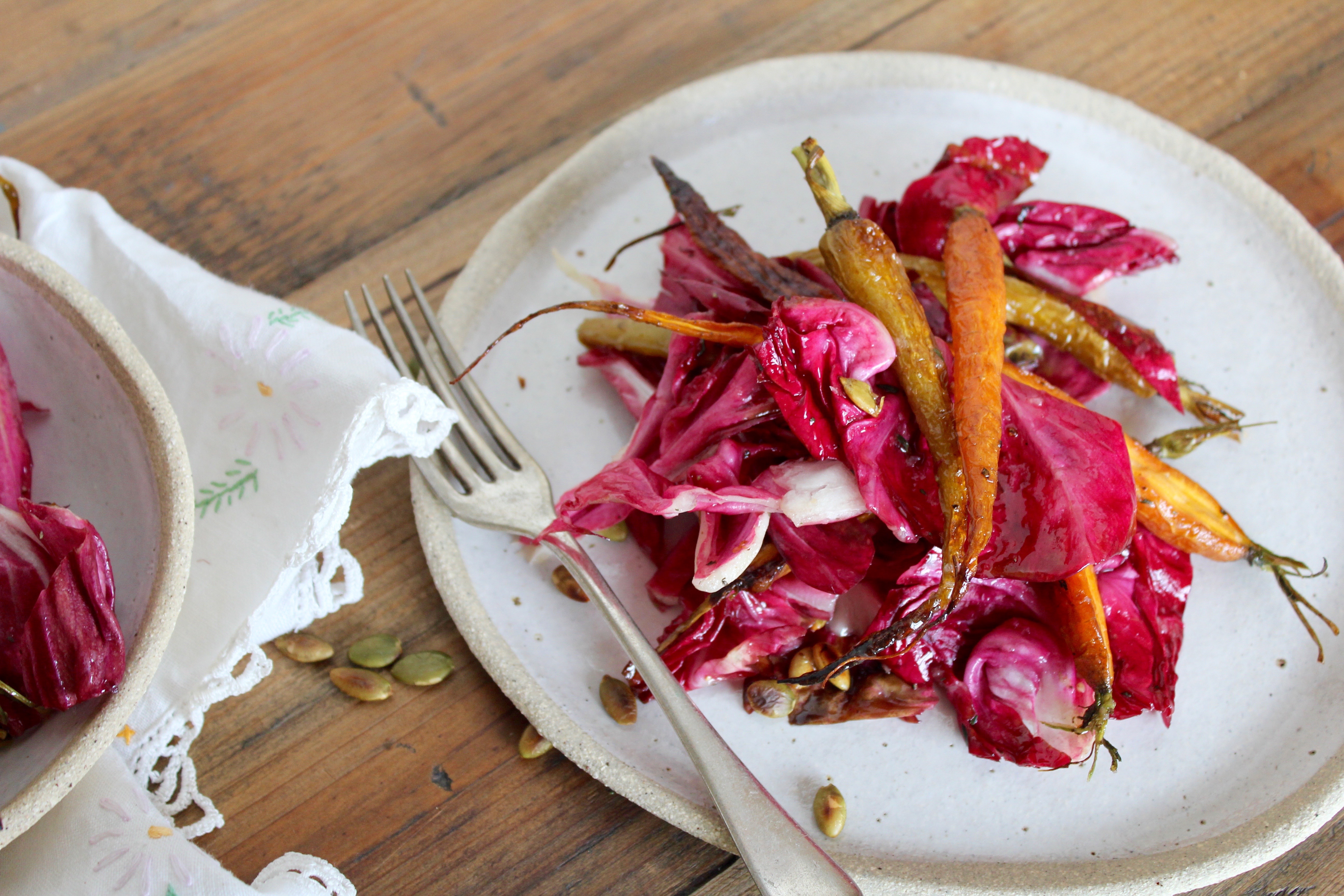 When the carrots are ready, toss them together with the radicchio leaves. Add the vinigarette and mix to combine. Top with the toasted pumpkin seeds.