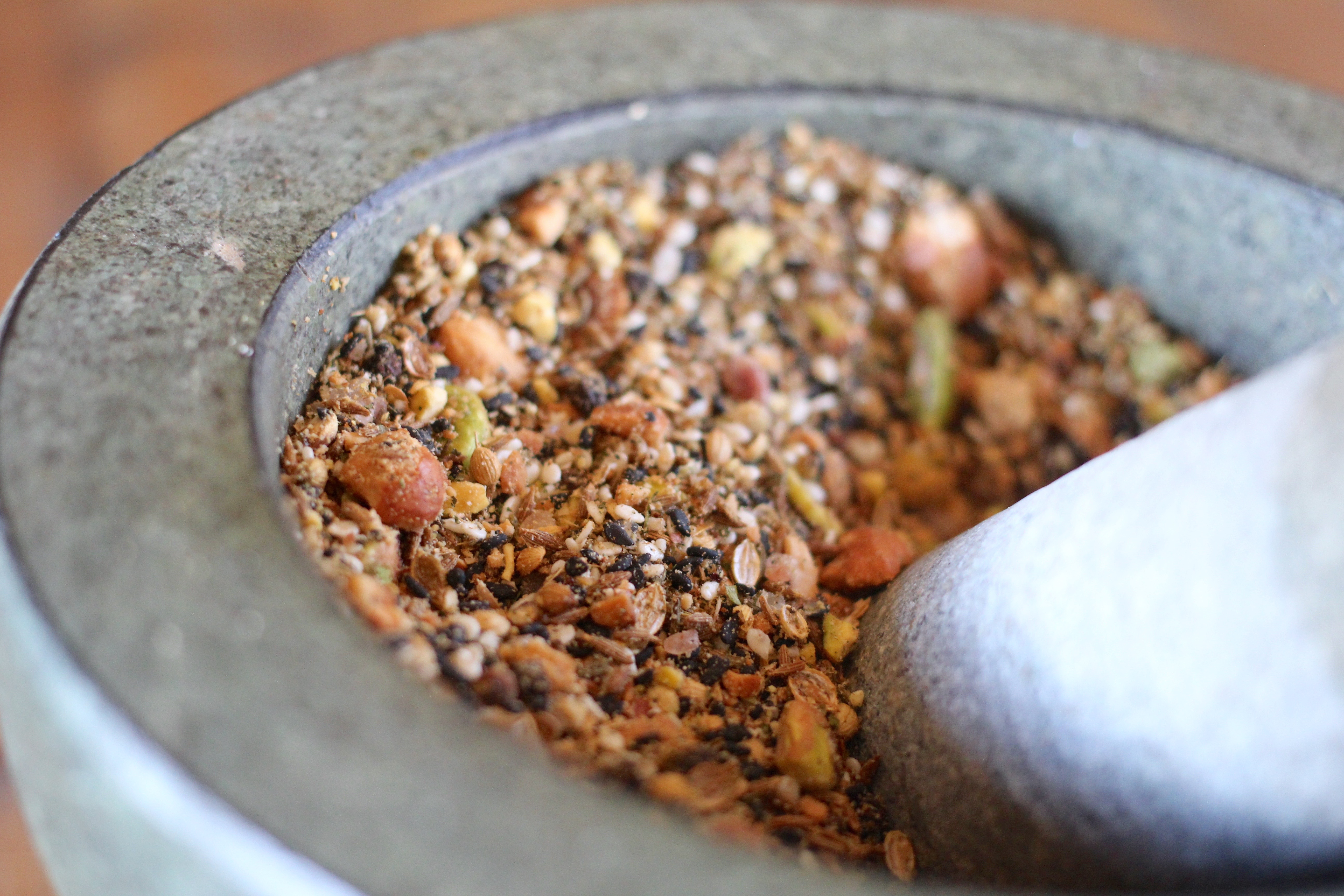 Add all of the ingredients to a food processor and pulse until combined to the consistency of crumbs, taking care not to turn into a paste. Alternatively, pound all of the ingredients together in a mortar and pestle until crushed and combined.