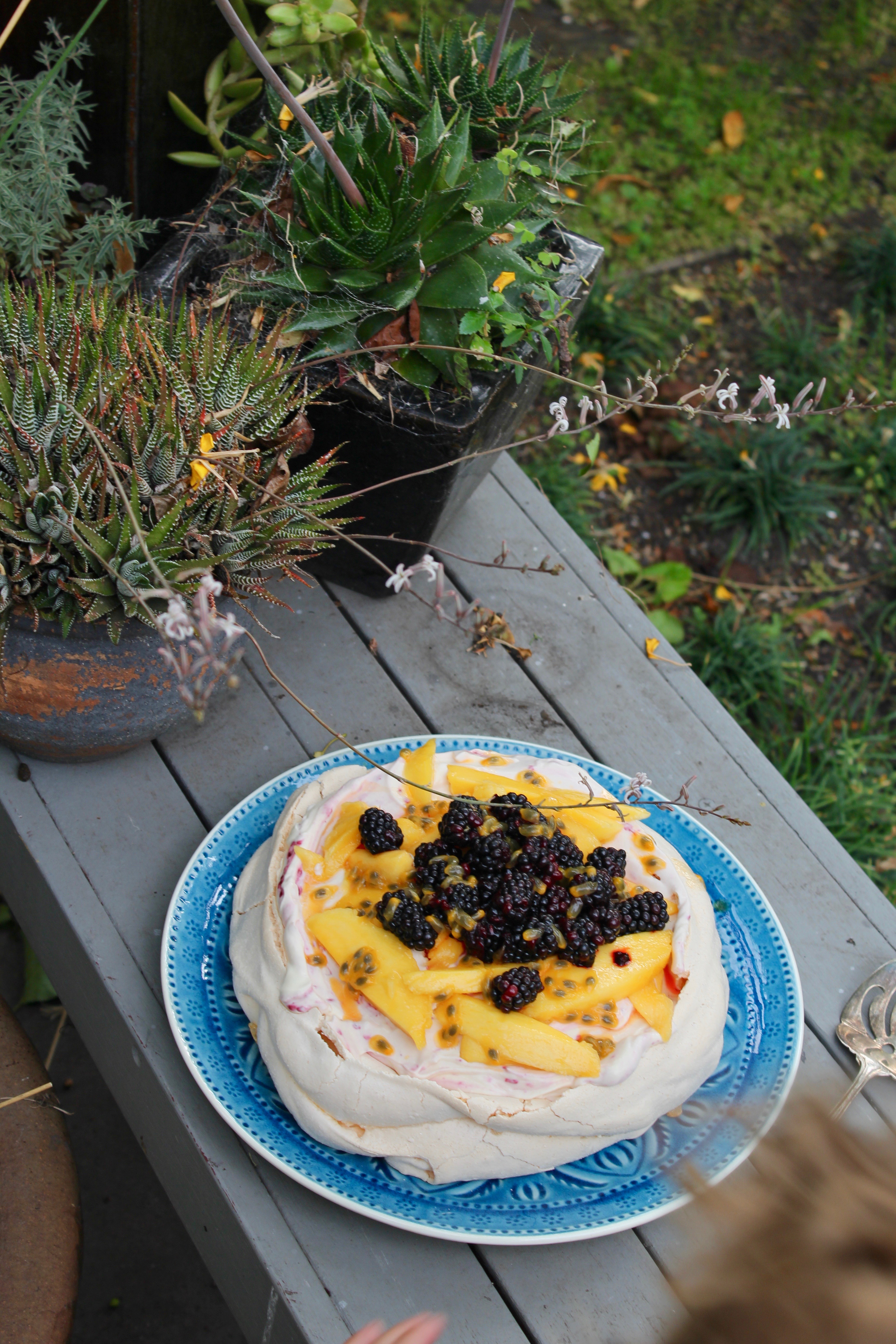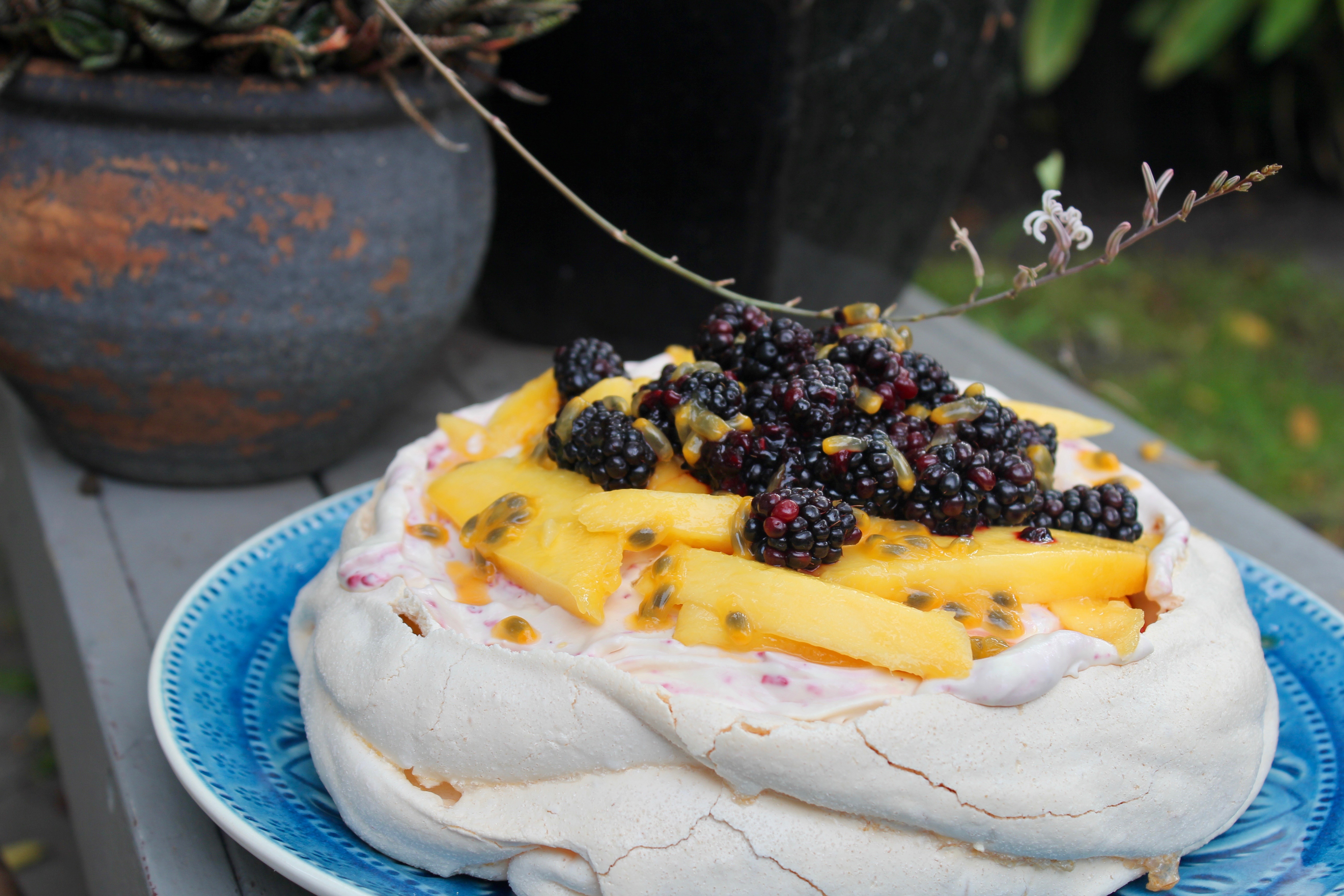 Spoon the cream onto the meringue, leaving a small border around the edge. Thinly slice your mango and put that on top of the cream, pile the blackberries into the middle, and finish it off by spooning the passionfruit over the whole lot.