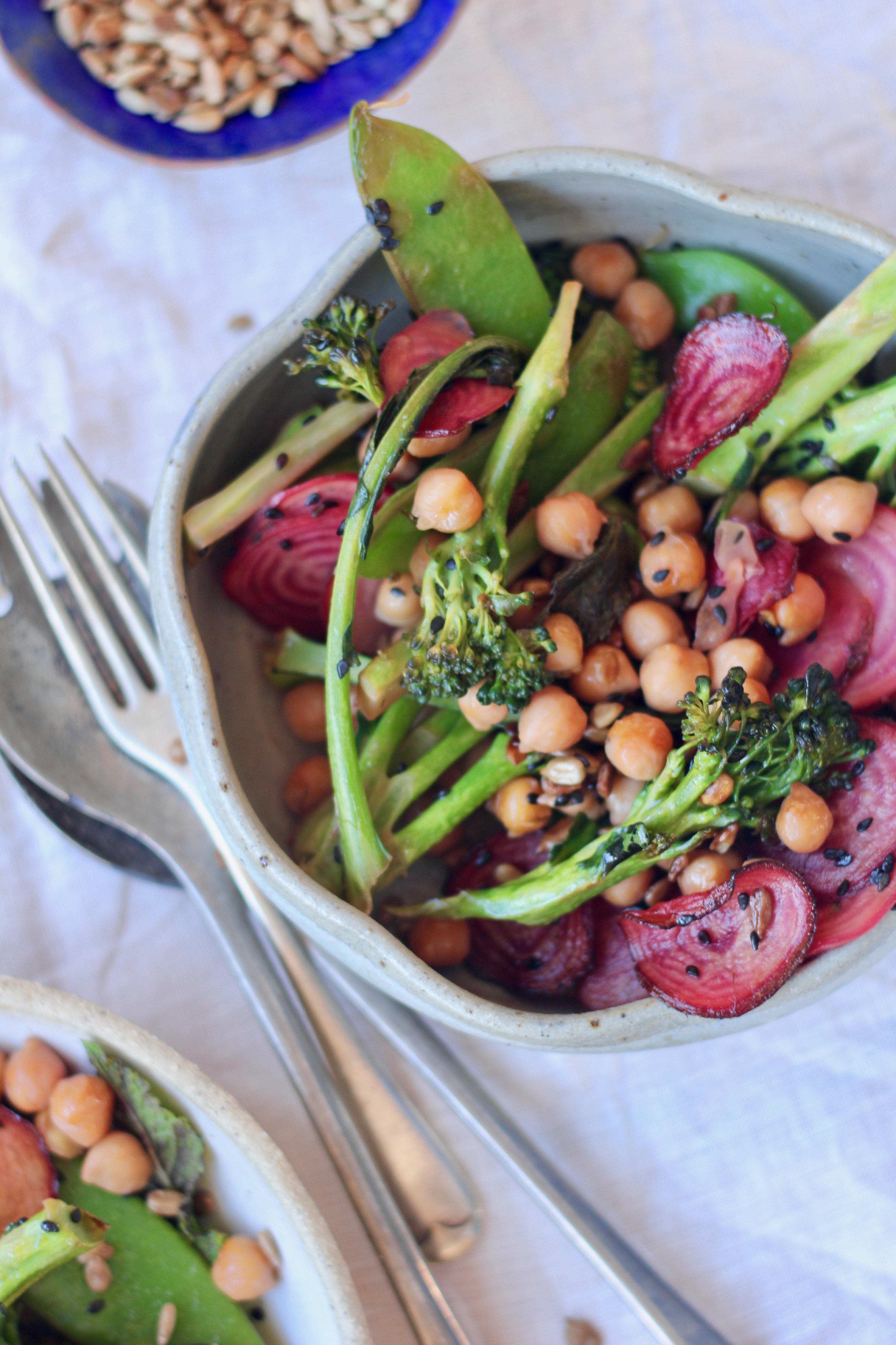 Heat the olive oil over a medium-high heat in a shallow, wide frypan. Add the sliced beetroot, broccoli and snowpeas. Sauté for 5 – 6 minutes, stirring frequently, until the vegetables begin to colour and crisp. Add the chickpeas, sesame seeds and sunflower seeds, and continue to cook, stirring frequently, for anther 3 – 4 minutes. Keep the heat high and stir frequently so that the veges retain their crunch! A little blistering is good, but if they start to wilt, then they’re ready to eat.