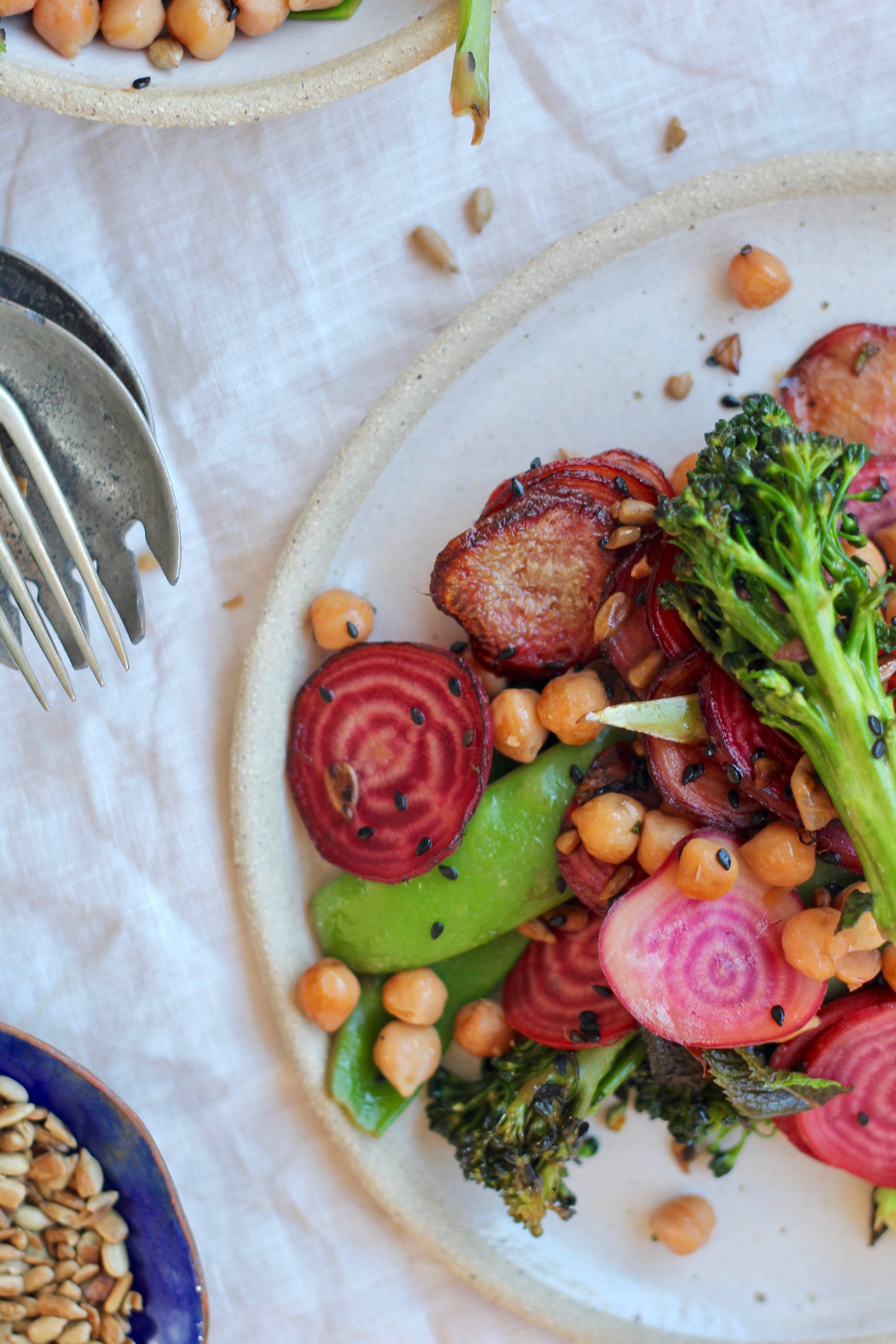 This Sautéed Beetroot, Broccoli & Chickpeas is the kind of dish that I find joyful to cook. The kind of dish I make when the haul from the markets is too fresh and buoyant to hide beneath sauces or frittatas or curries. I made this dish frequently at the end of last year, when the farmers markets were piled high with baby beetroot in candy stripes of pink and white, tightly coiled broccoli trees, sweet crispy snowpeas. It showcases the vegetables in all of their glory, just a splash of heat and oil to draw out the flavours.