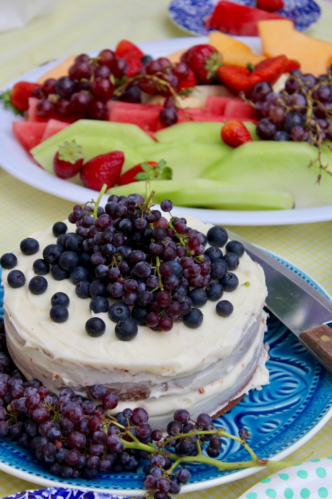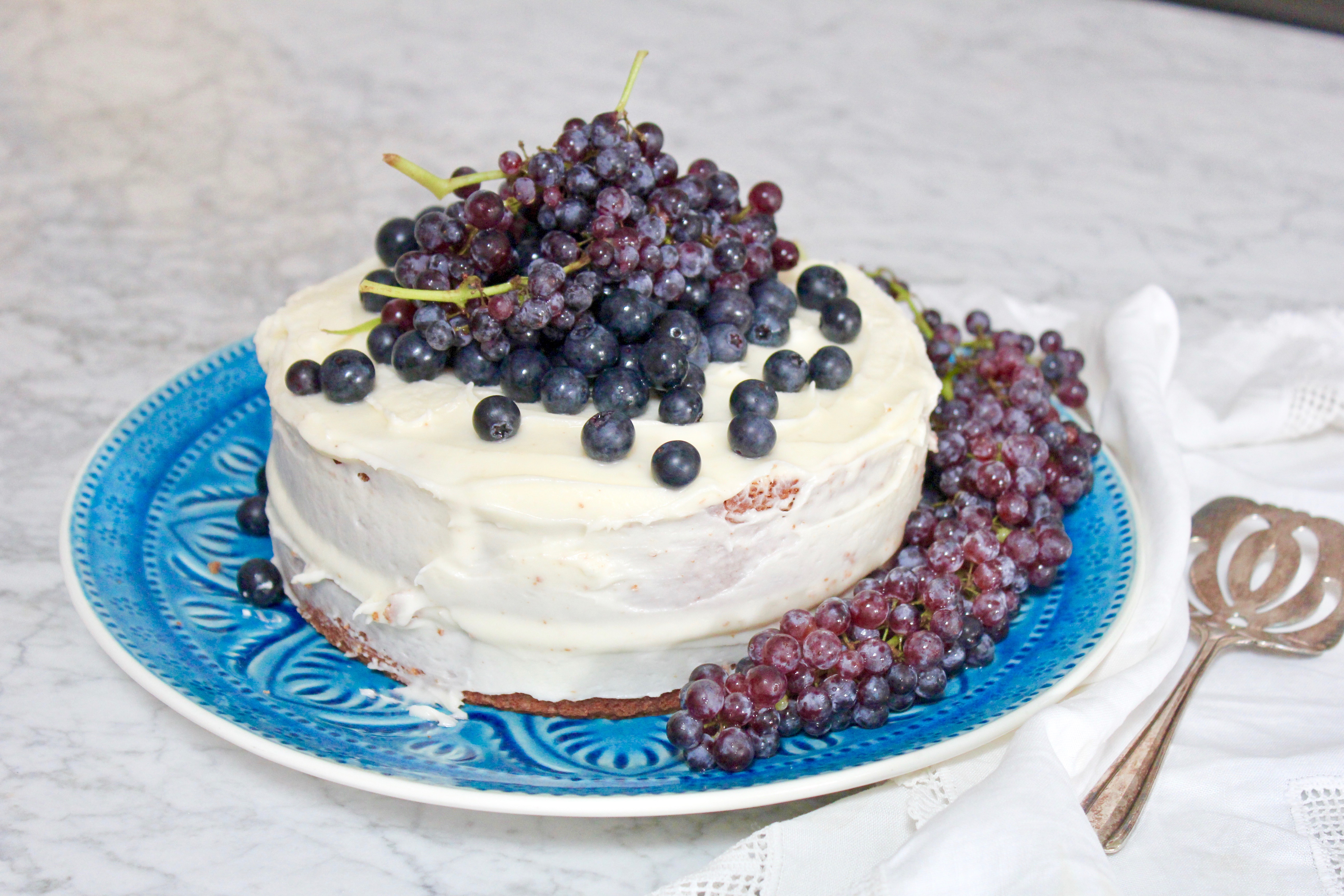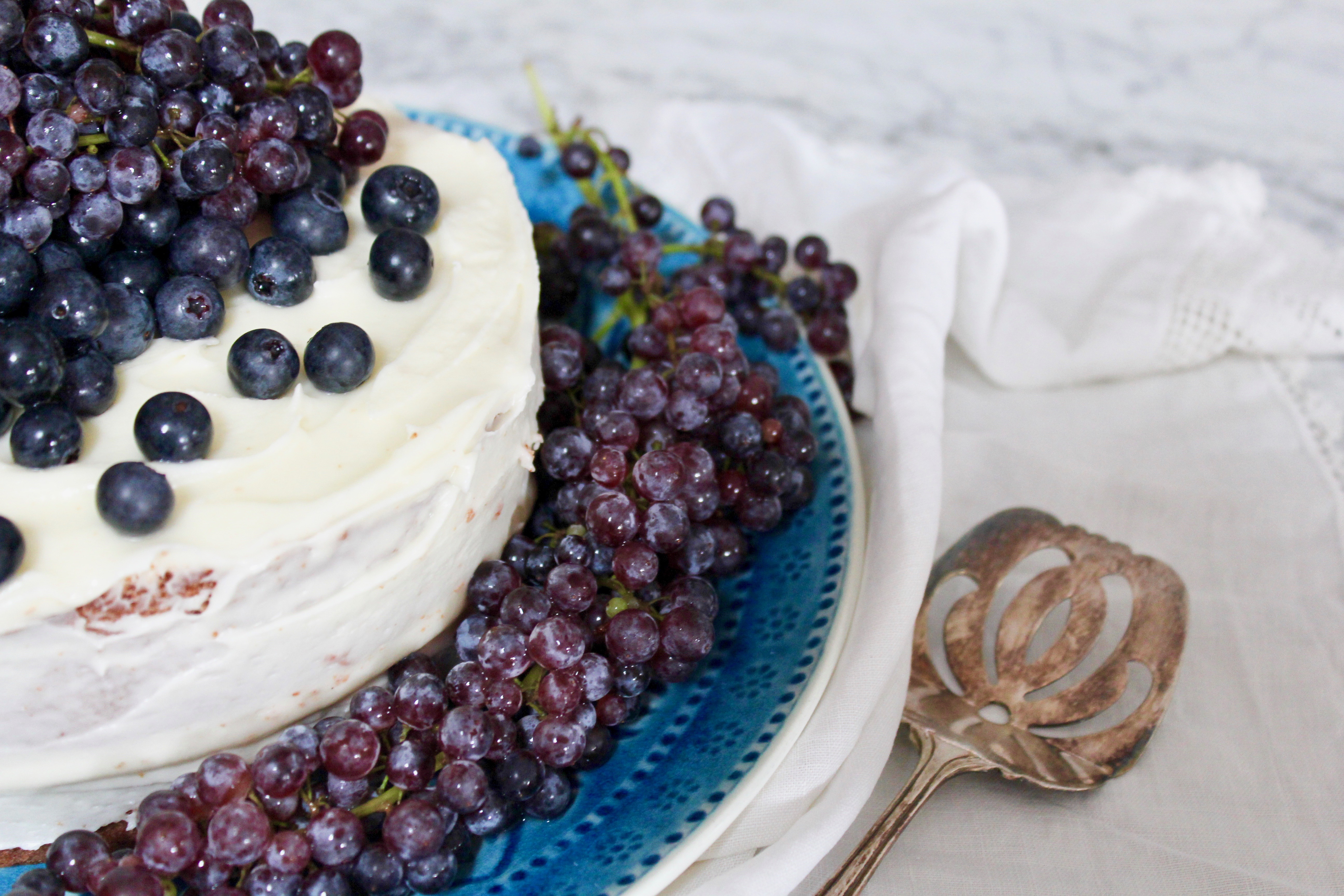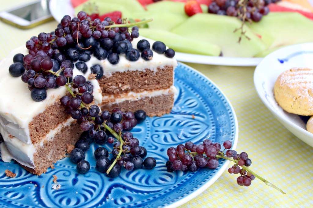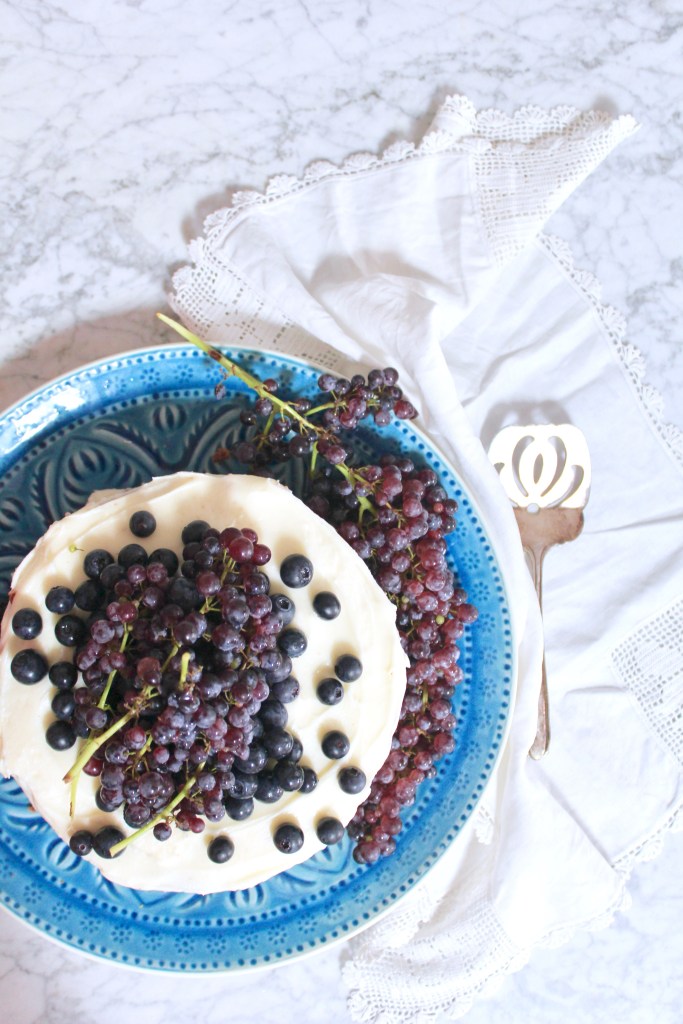 When you’re ready to serve, top the cake with handfuls of whatever berries you have on hand – blueberries, raspberries, mulberries, currants.