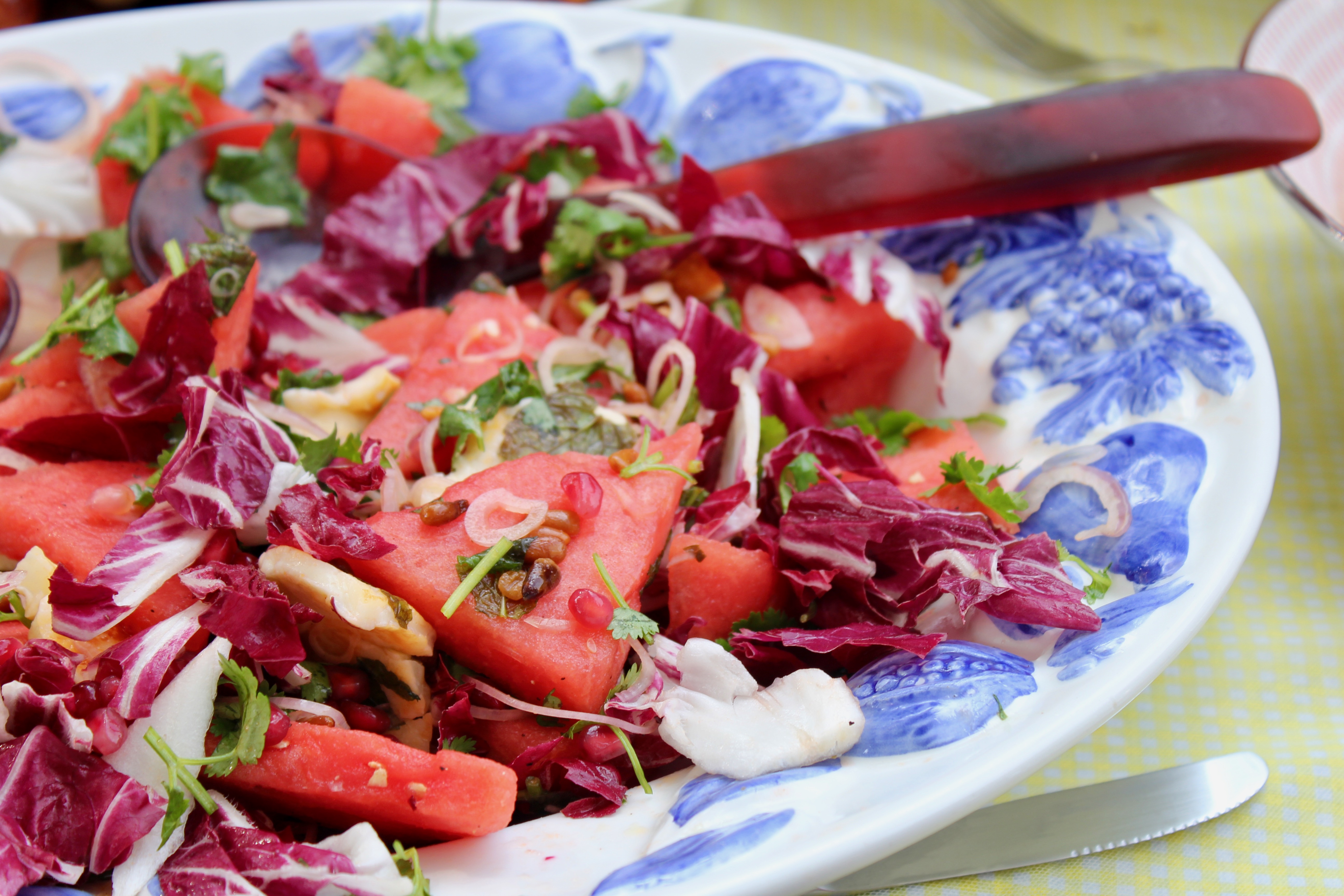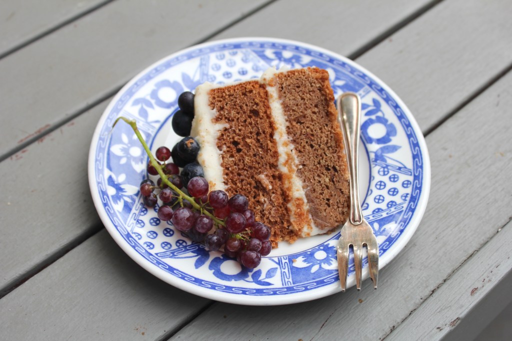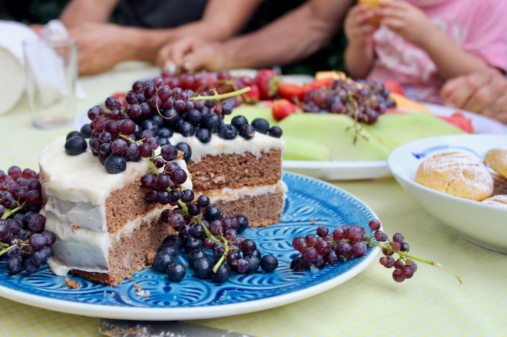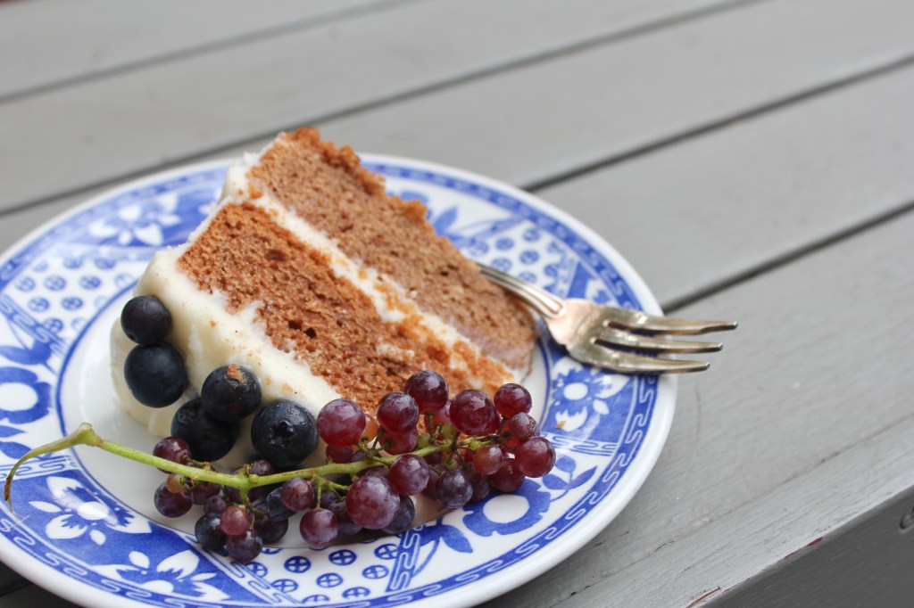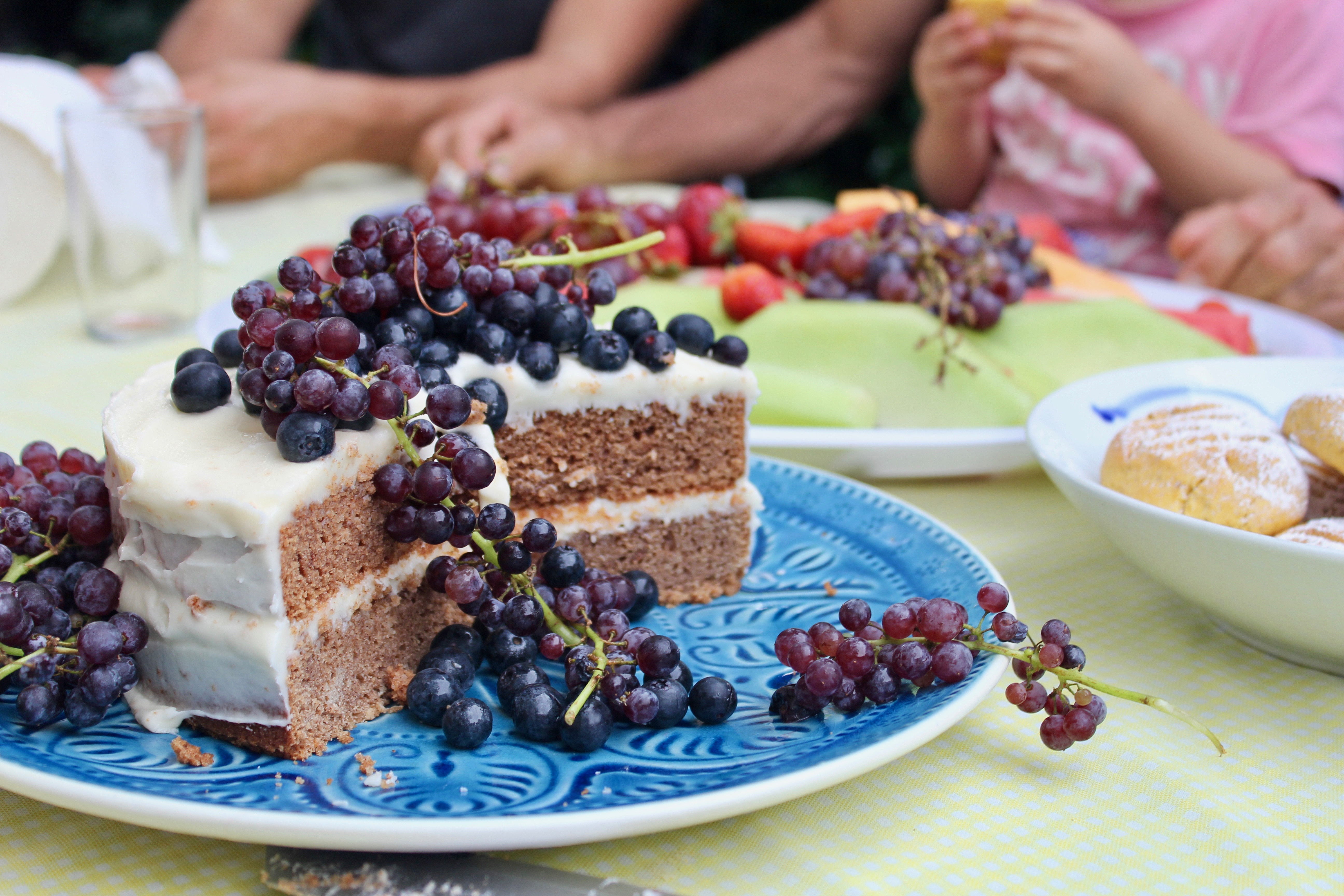 When you’re ready to serve, top the cake with handfuls of whatever berries you have on hand – blueberries, raspberries, mulberries, currants.
