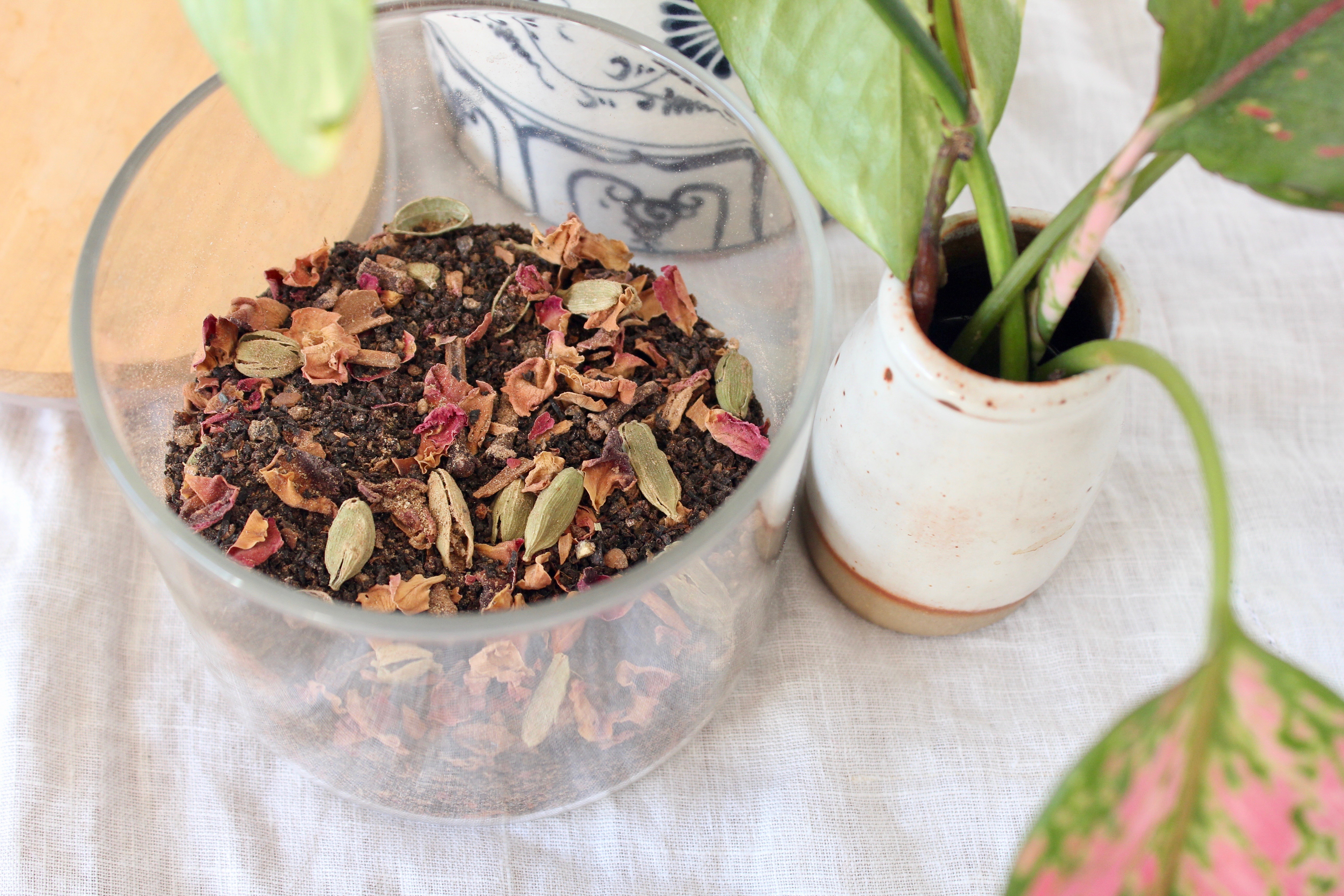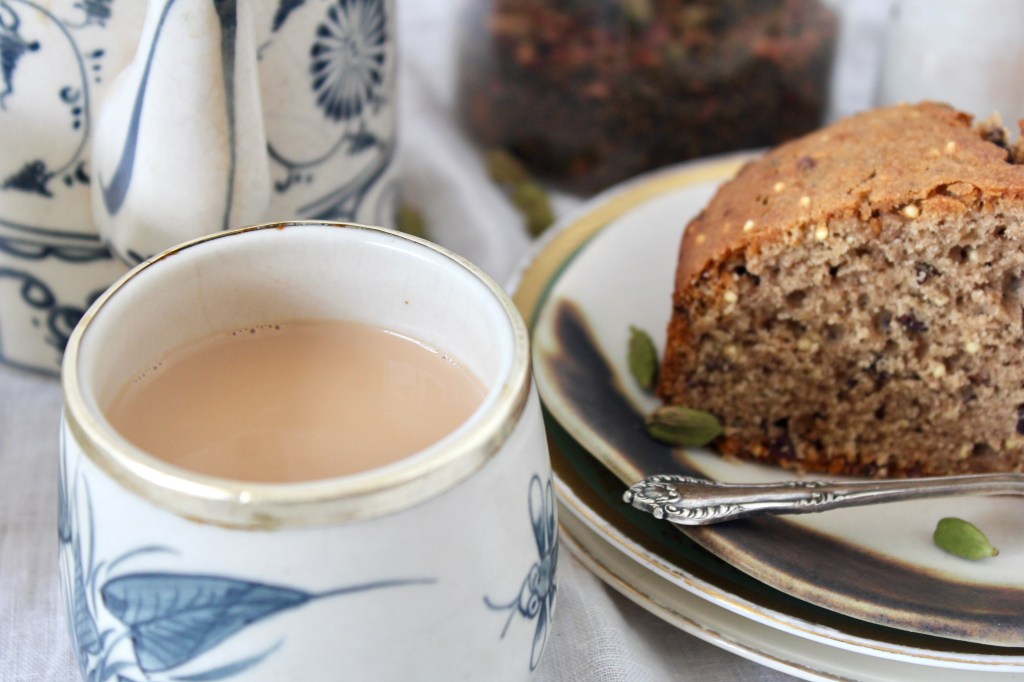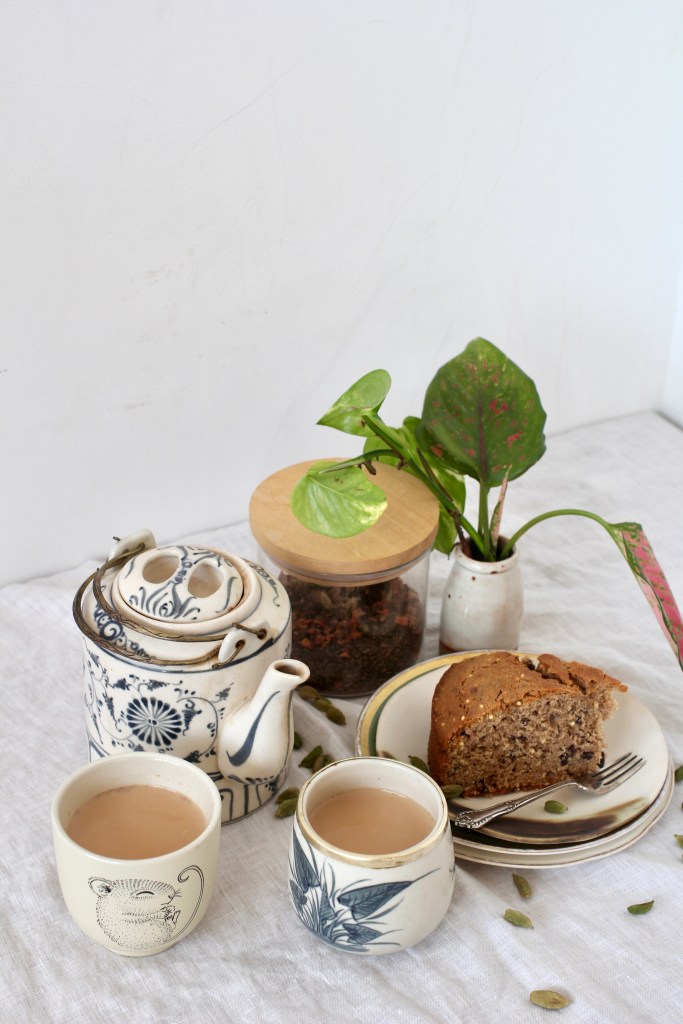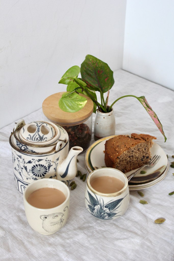 My recipe for Masala Chai below is pretty traditional (except for the rose petals, which W insists in adding and which do add a lovely floral note). I also like it heavy on the ginger to give it a spicy kick. You can use either a spice grinder or a mortar & pestle to make your masala chai mix; I prefer the tactility of the latter. There is a deep sense of satisfaction in grinding spices by hand, releasing their colour and aroma into the air. And I always brew my tea in a pot on the stove with the milk (rather than in a teapot), redolent of the masala chai I drank all across India.