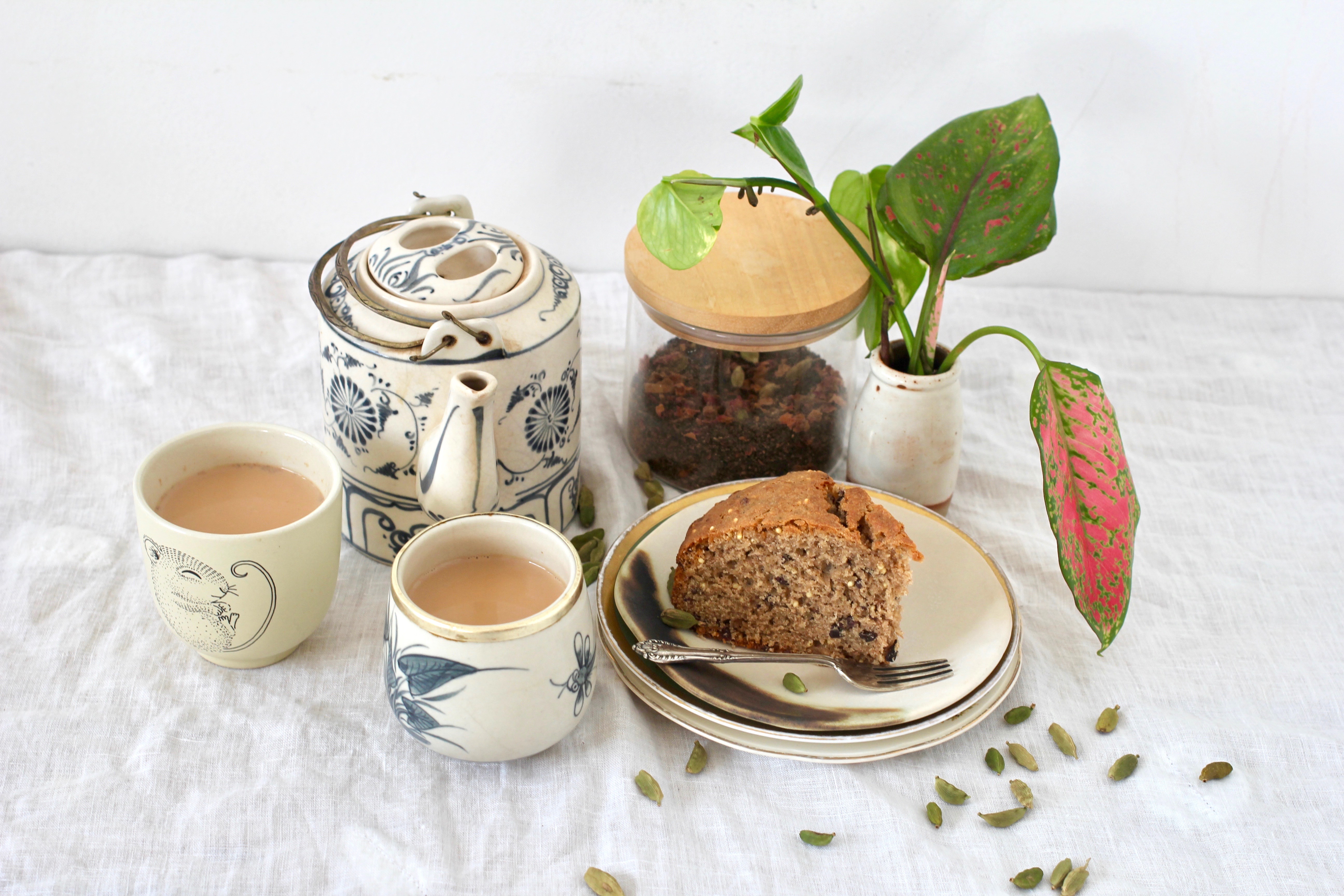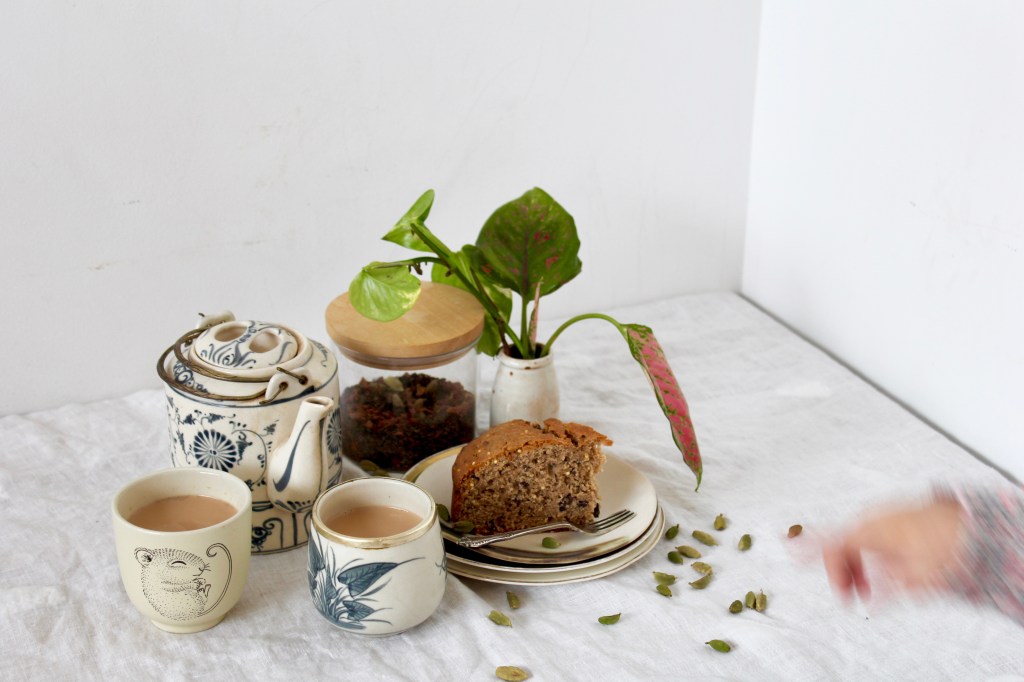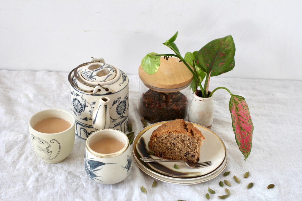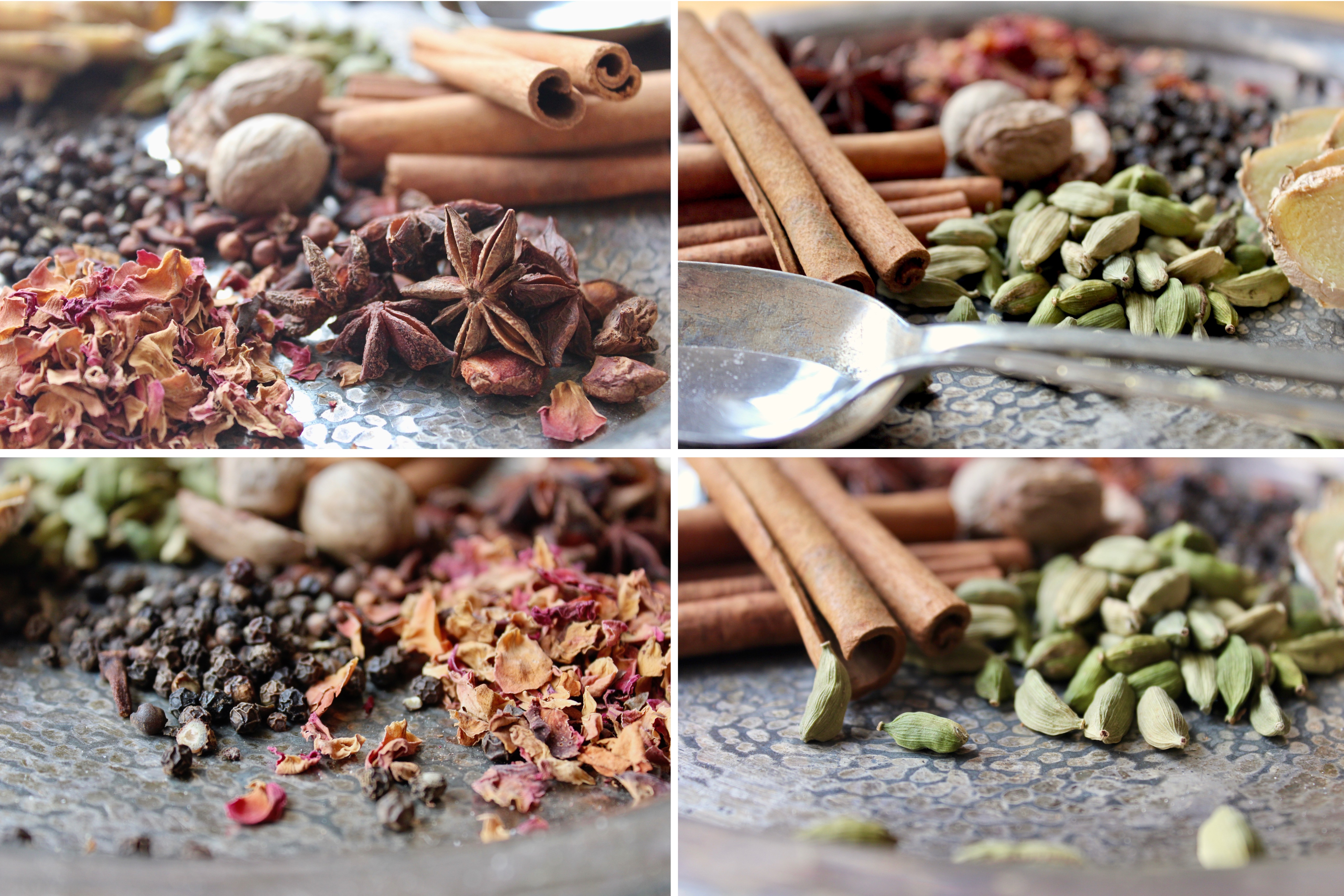 My recipe for Masala Chai below is pretty traditional (except for the rose petals, which W insists in adding and which do add a lovely floral note). I also like it heavy on the ginger to give it a spicy kick. You can use either a spice grinder or a mortar & pestle to make your masala chai mix; I prefer the tactility of the latter. There is a deep sense of satisfaction in grinding spices by hand, releasing their colour and aroma into the air. And I always brew my tea in a pot on the stove with the milk (rather than in a teapot), redolent of the masala chai I drank all across India.