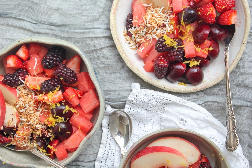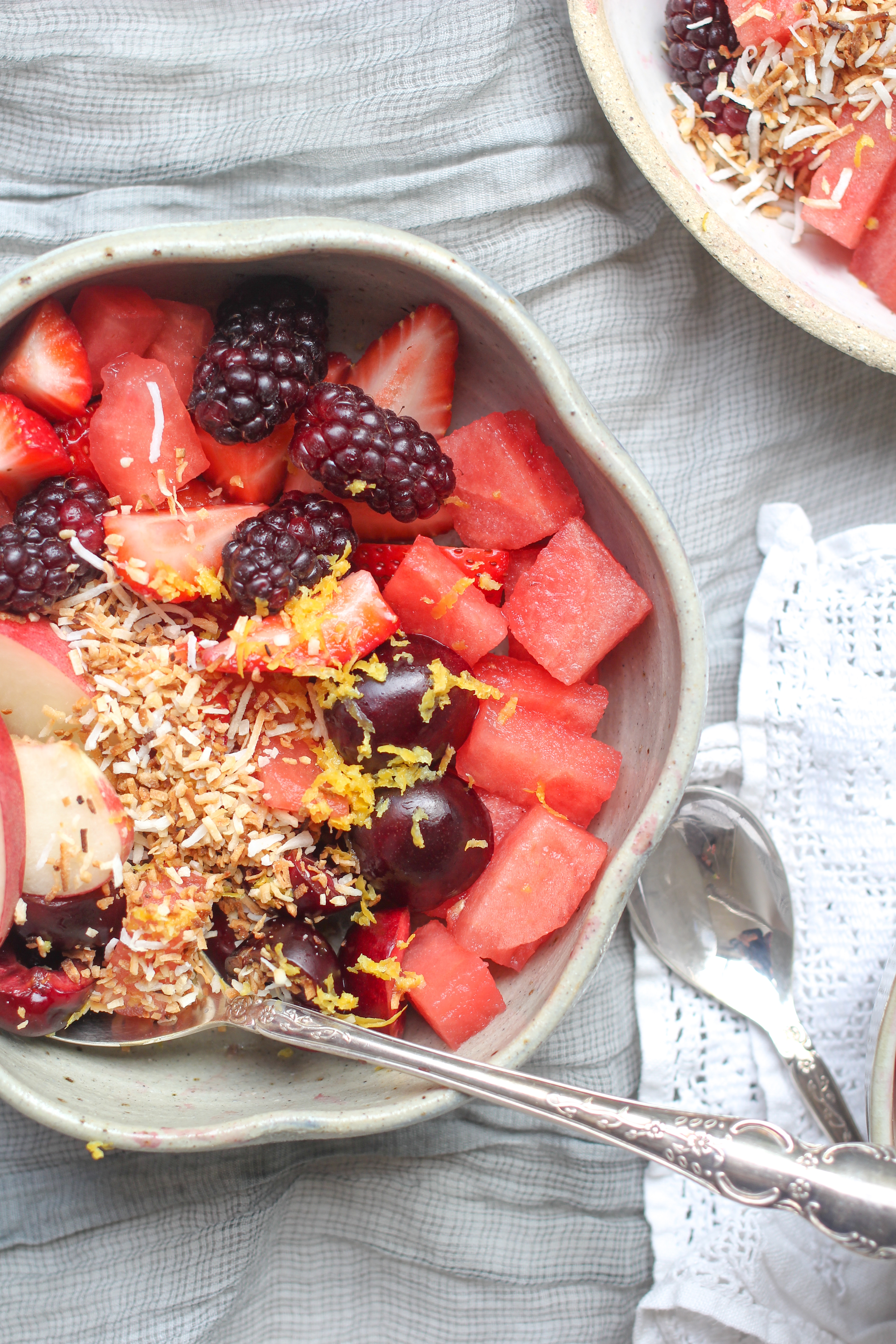All of my favourite rain memories are humid rains, summer rains, almost-tropical rains. The kinds of rains best enjoyed eating the fresh fruit of early summer – watermelon and cherries. Oh, the cherries! So here, a summer red(ish) fruit salad to make the most of these final (rainy) days.