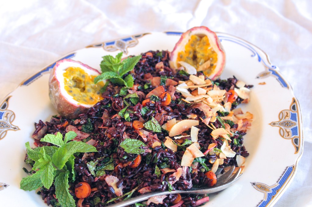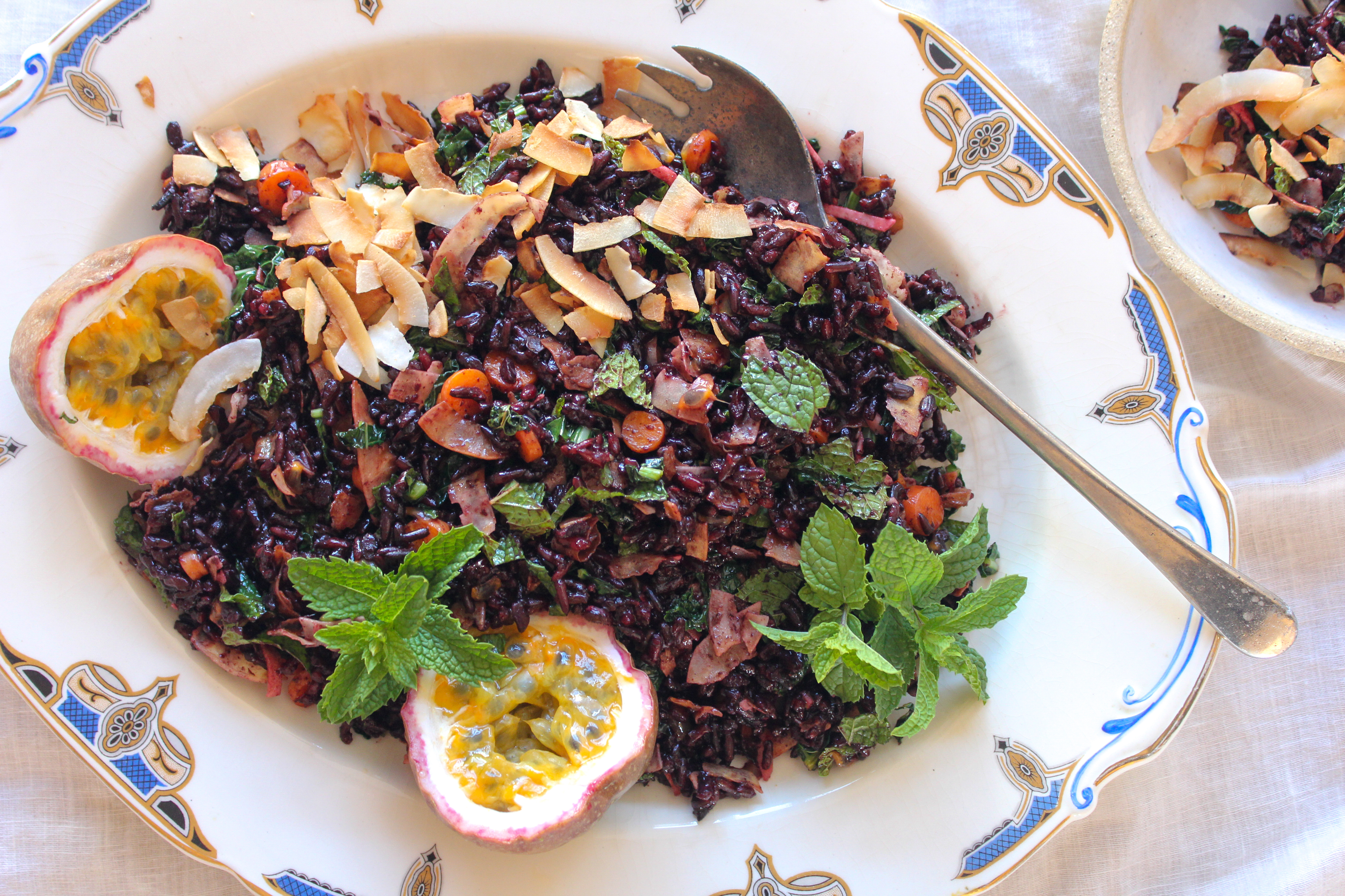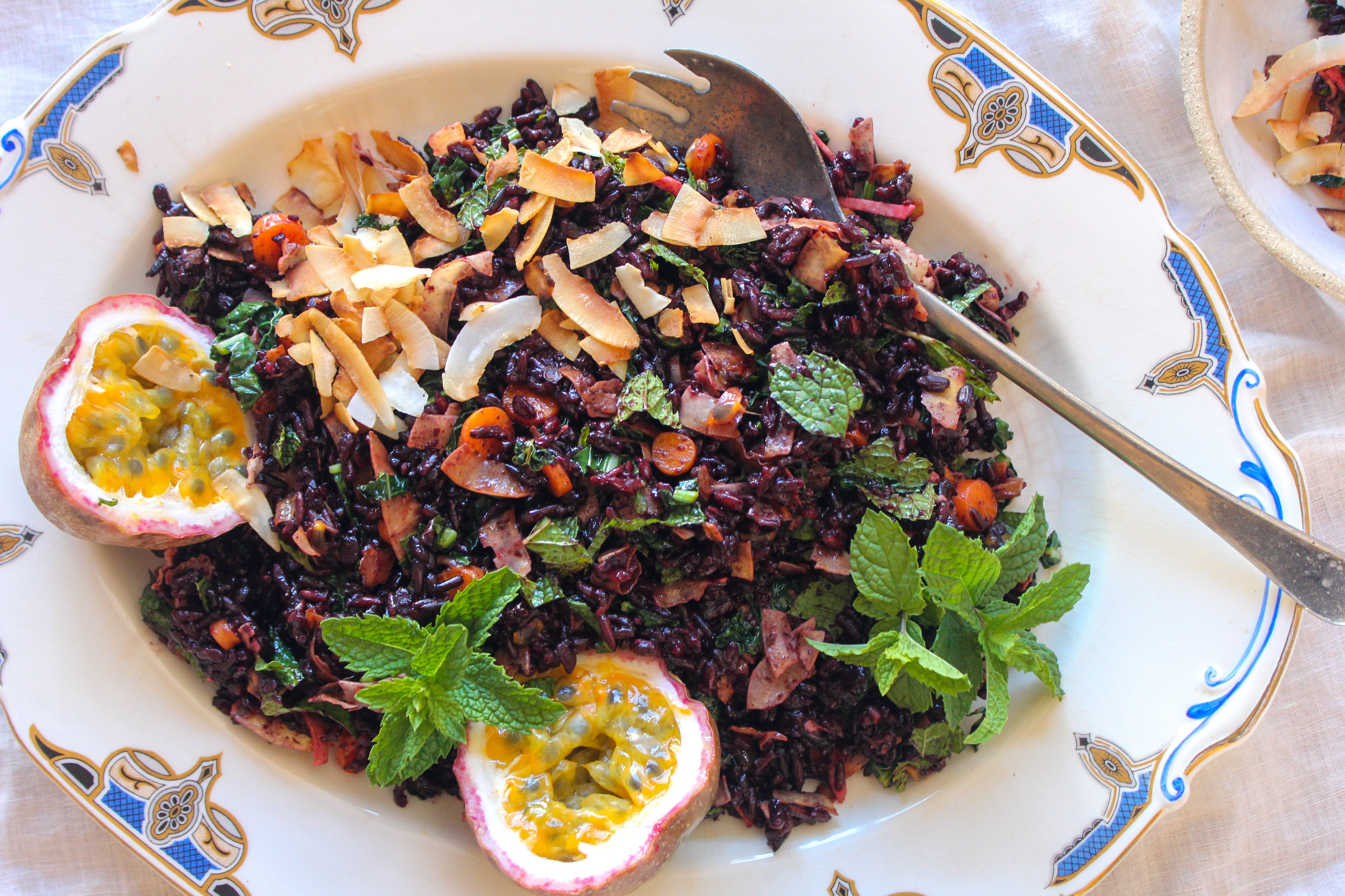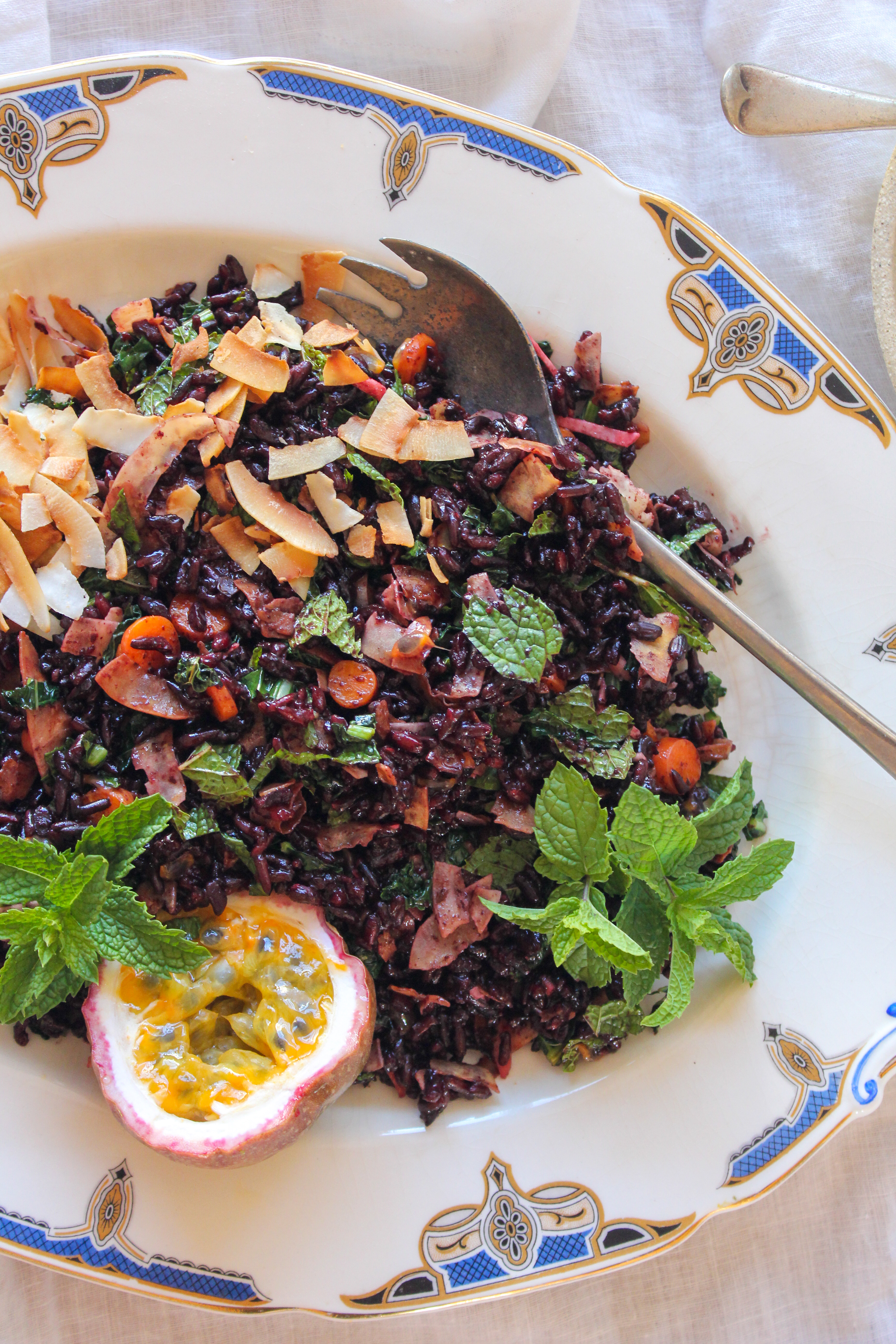 Time eating is, of course, always time well spent. The kids are somewhat picky eaters, but they are also appreciative of the pleasures of cooking, of baking, of planning and sharing a meal. This salad is one that I planned in my mind for ages after the purple-skinned passionfruit began appearing heaped into piles in the market. And then the first time I made it, it came off just as I had imagined. The backbone of this salad is, of course, the passionfruit. The sweet/sour tang plays off the the fresh mint and the toast-y coconut just beautifully. The rice and the vegetables provide some body and it all comes together to taste just like summer-in-a-bowl should taste.